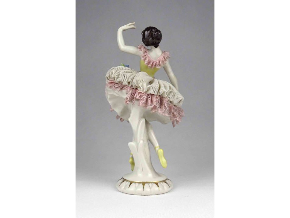 Antik, szép állapotú tüllszoknyás Volstedter porcelán balerina. Szoknyáján több helyen kisebb letörések találhatóak, jobb kezének mutatóujja hiányzik, lásd fotó.