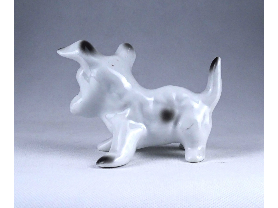 Régi, hibátlan állapotú, fekete foltos fehér porcelán kutya foxi, fox terrier figura.