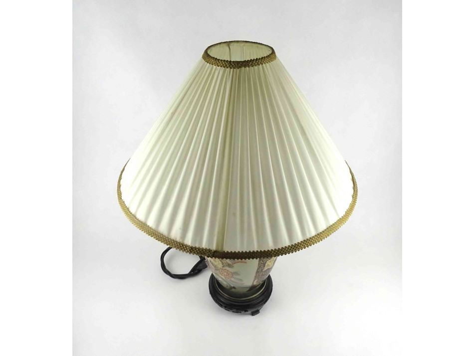 Régi, hibátlan állapotú, nagyméretű, áttört fa talapzaton álló porcelán testű keleti asztali lámpa. A test kézzel festett, kínai virágmotívumokkal díszített, gazdagon aranyozott. Rajta hozzá illő, nagyméretű textil lámpabura. Egy nagyméretű (E27) izzó való bele. Működőképes állapotban.