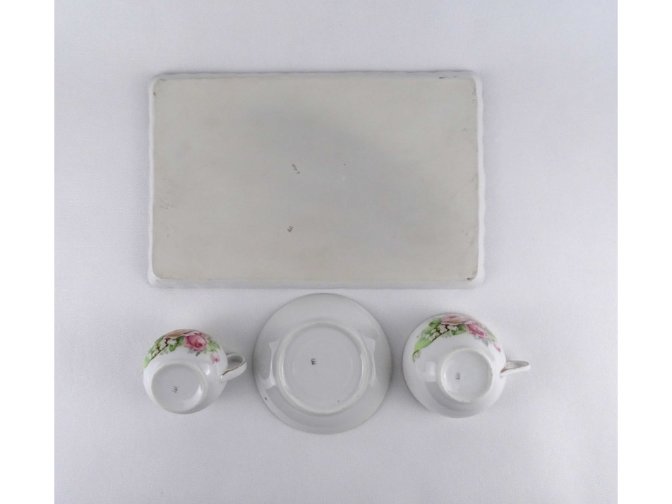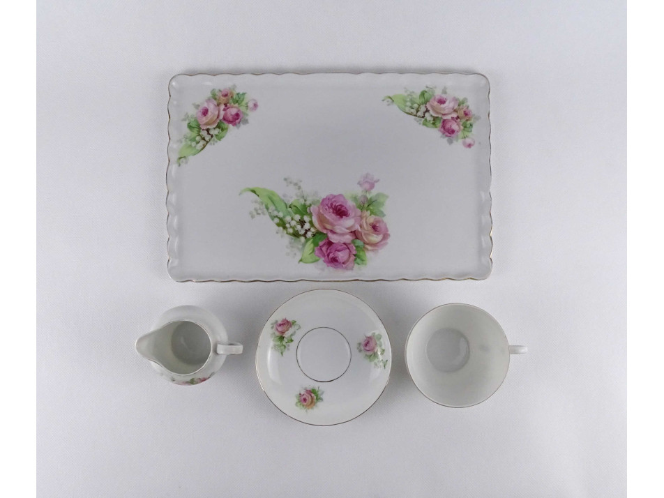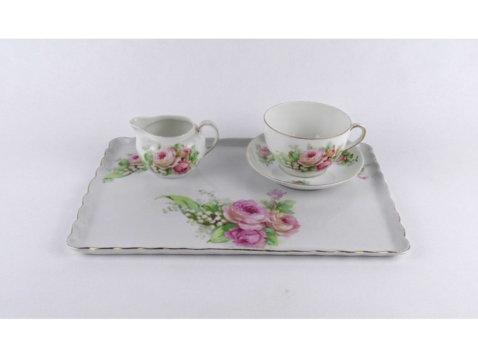 Régi rózsa mintás porcelán reggeliző készlet, teás vagy kávés készlet