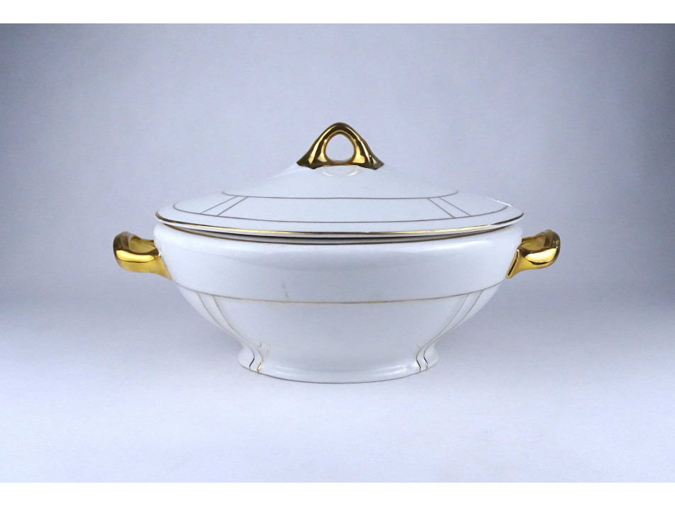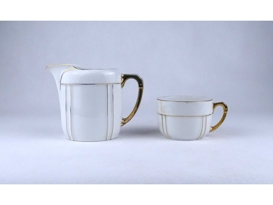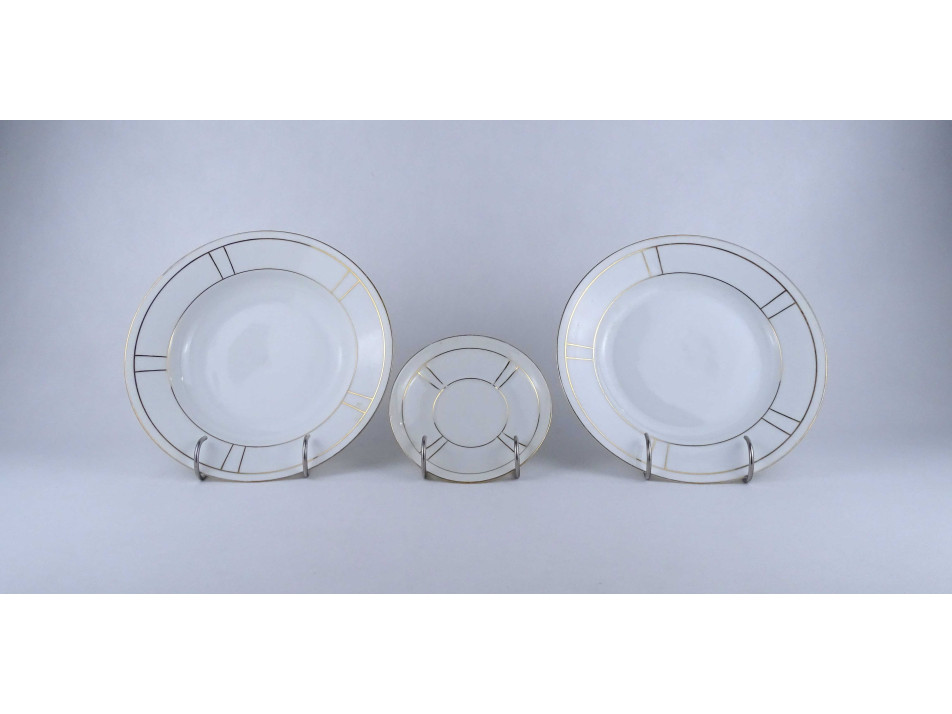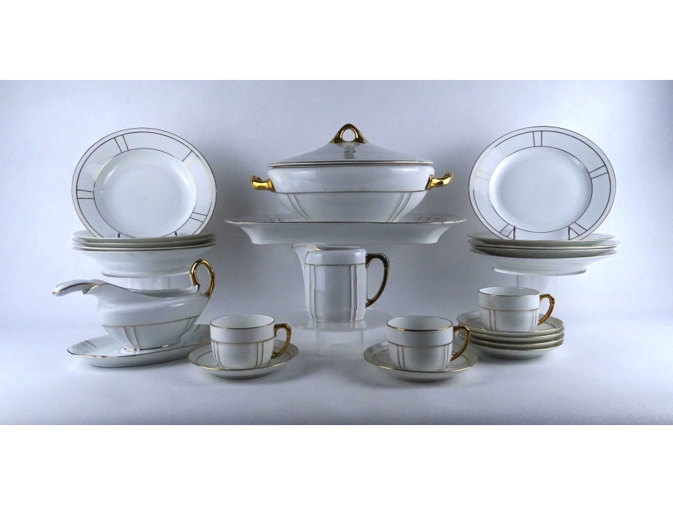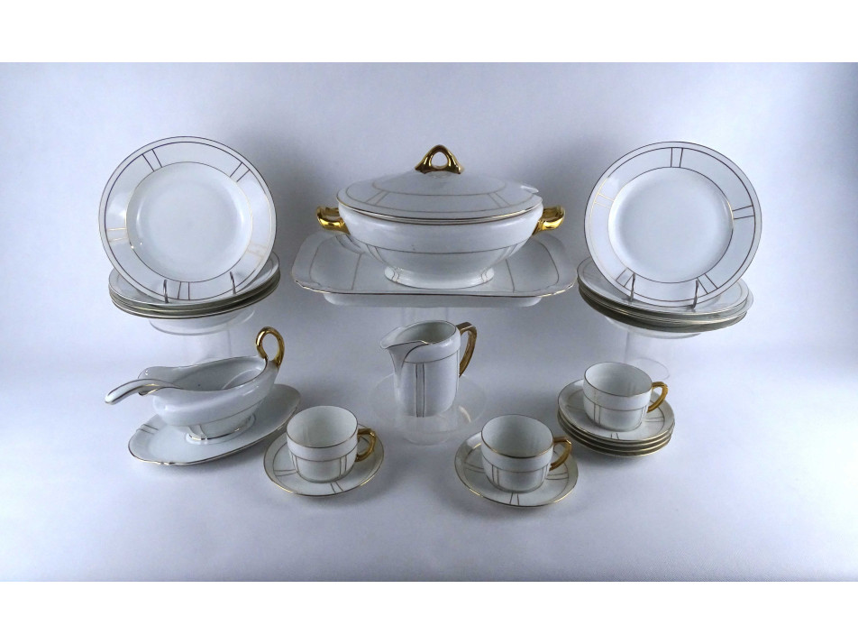 Régi, hibátlan állapotú, szélén finoman aranyozott porcelán készlet, étkészlet és teáskészlet töredék.