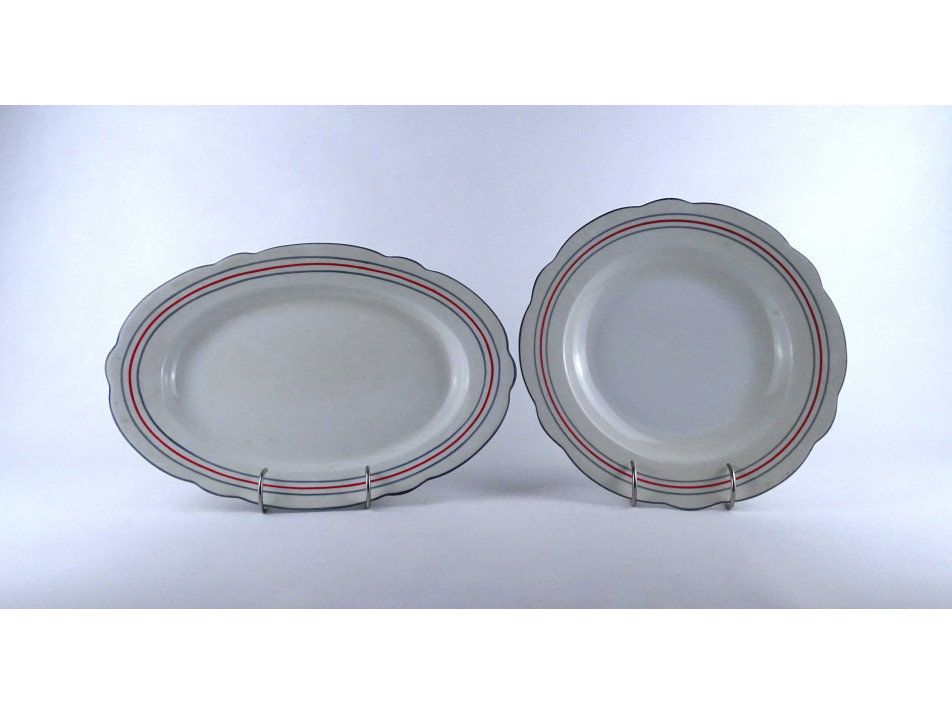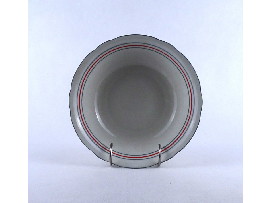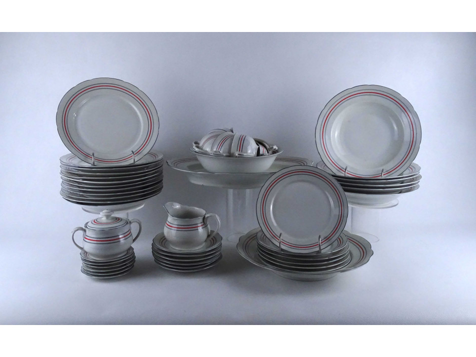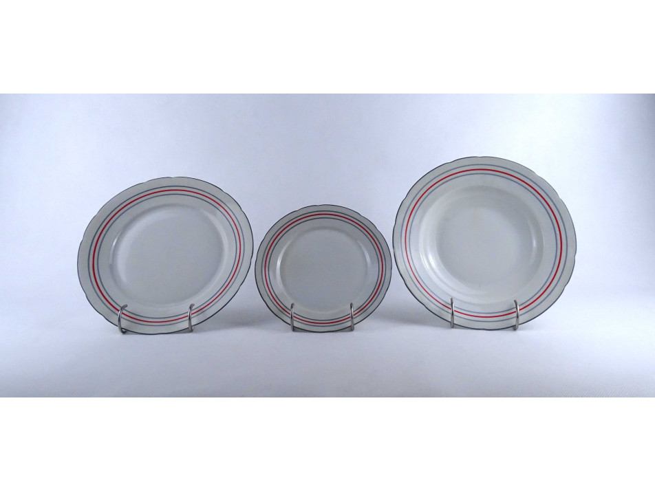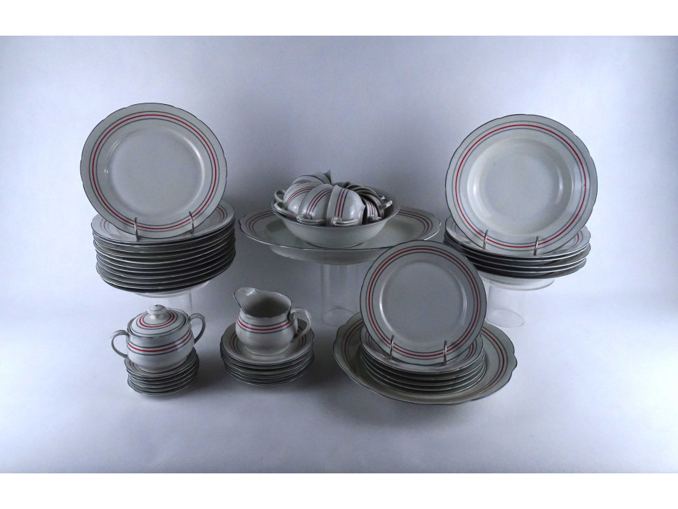 Retro, hat személyes, jelzetlen, piros szürke csíkos, napi használatú, porcelán tányér készlet, étkészlet, teás és kávéskészlet, 53 darab.