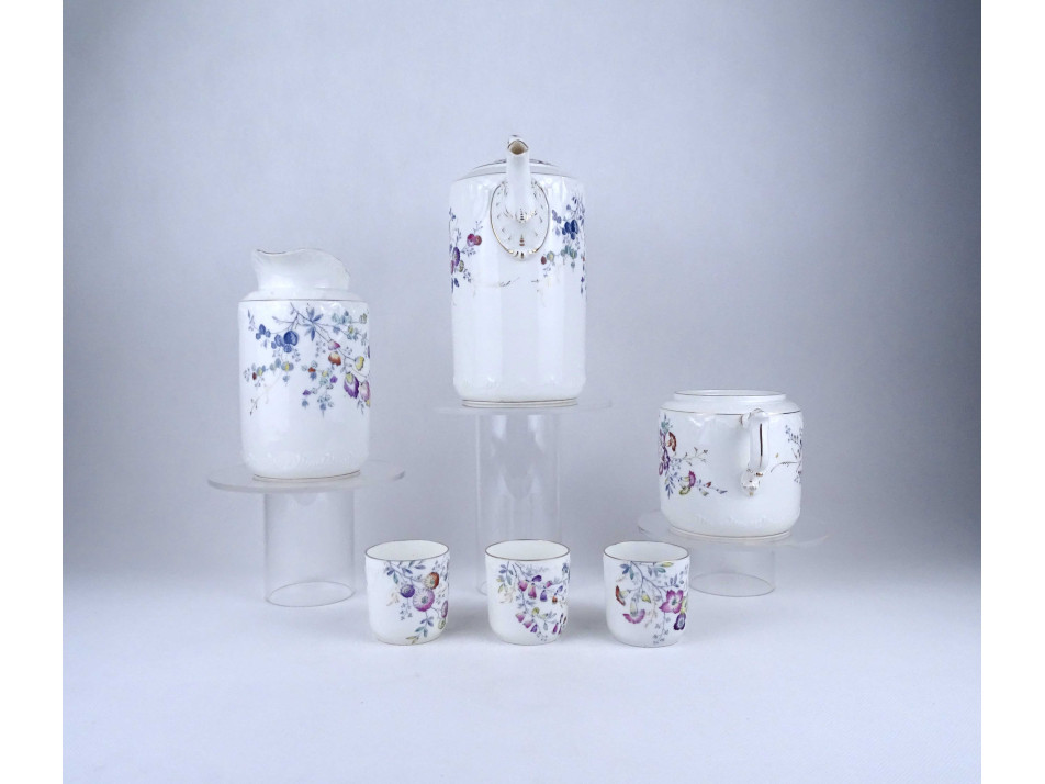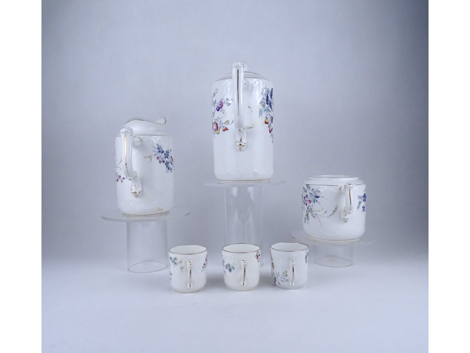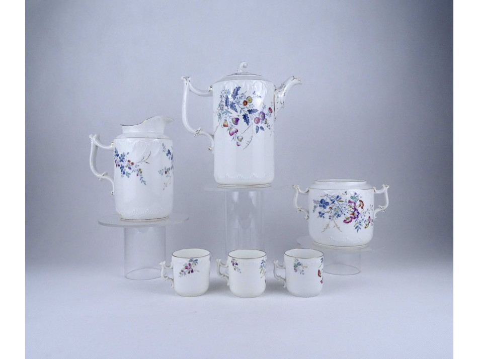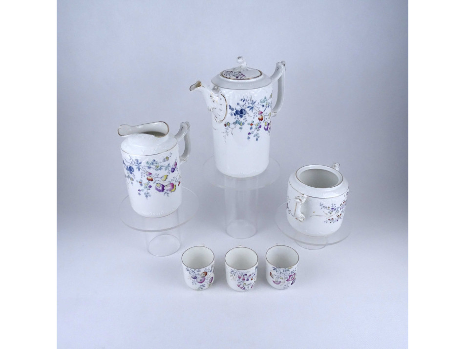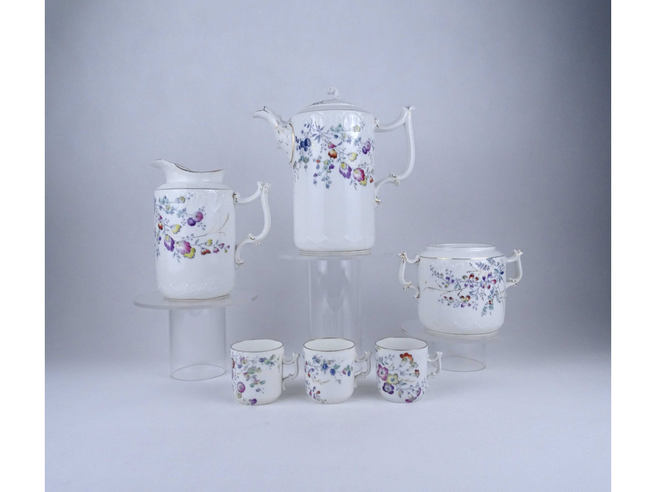 Antik, szép állapotú, jelzetlen barokk formavilágú porcelán kávéskészlet, virágmintával díszítve. A készlet erősen hiányos.