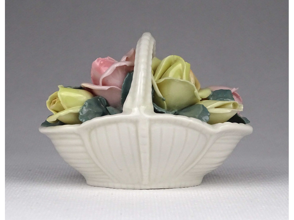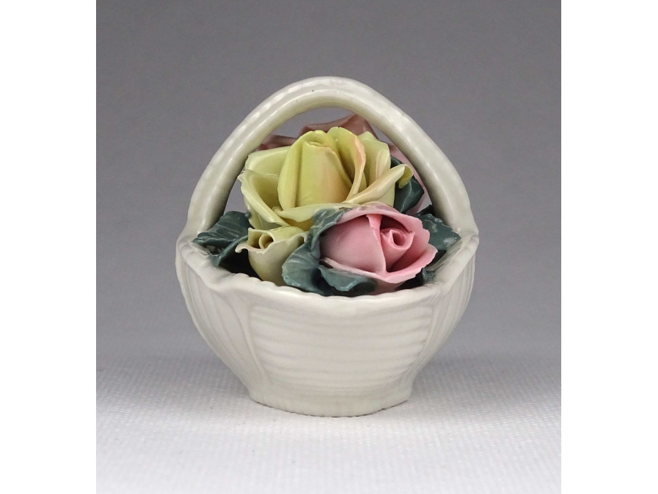 Régi, hibátlan állapotú, Ens porcelán kosár, benne rózsacsokor. Alján zöld színű márkajelzés: ENS GERMANY Formaszám: 7307