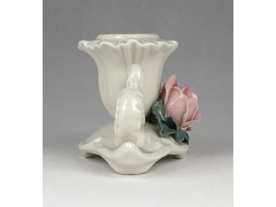 Régi, szép állapotú, kis méretű, német Ens porcelán gyertya tartó, rajta középen plasztikus rózsa díszítéssel. A rózsa szirmain apró lepattanások láthatók.