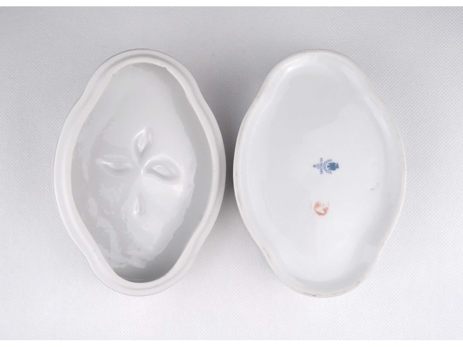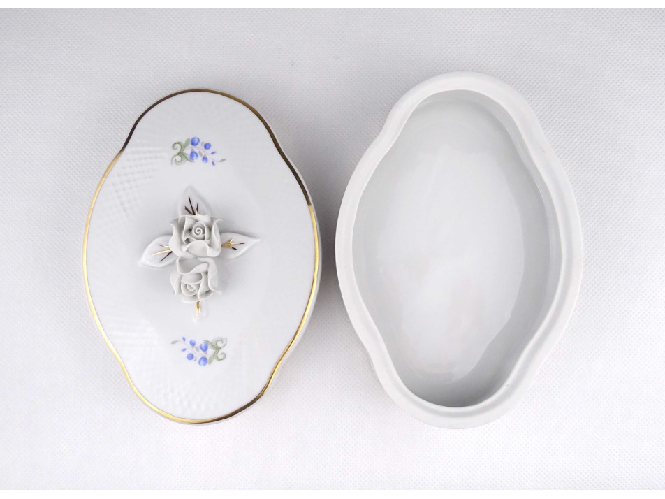 Hibátlan állapotú, gazdagon aranyozott, ovális alakú Hollóházi porcelán bonbonier, gyűrűtartó, ékszertartó, tetején dupla rózsa díszítéssel.