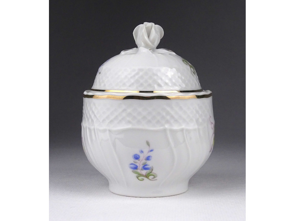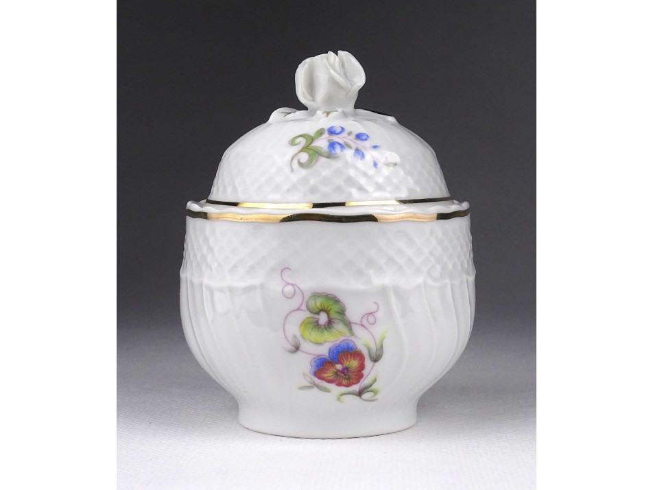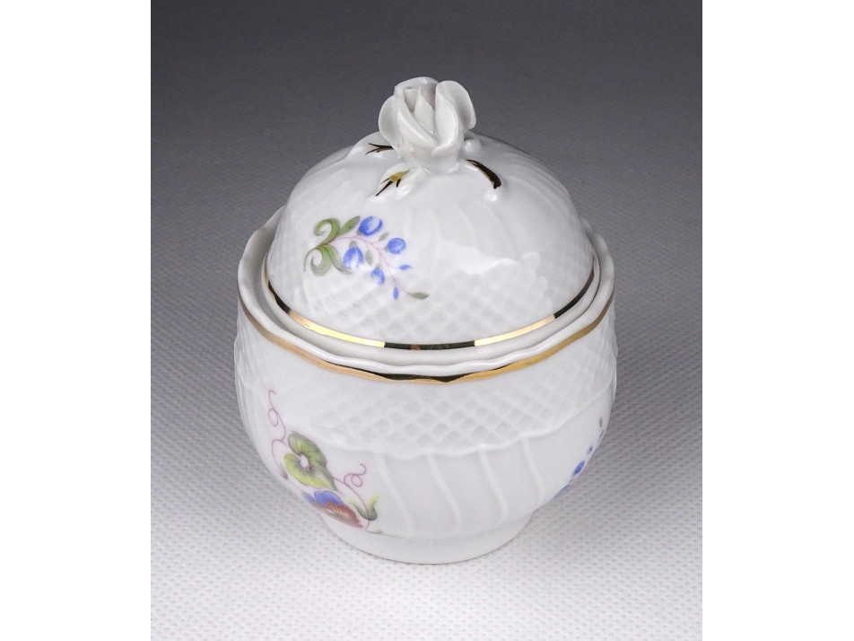 Hibátlan állapotú Hajnalka mintás hollóházi porcelán bonbonier. Tetején rózsadíszítés látható.