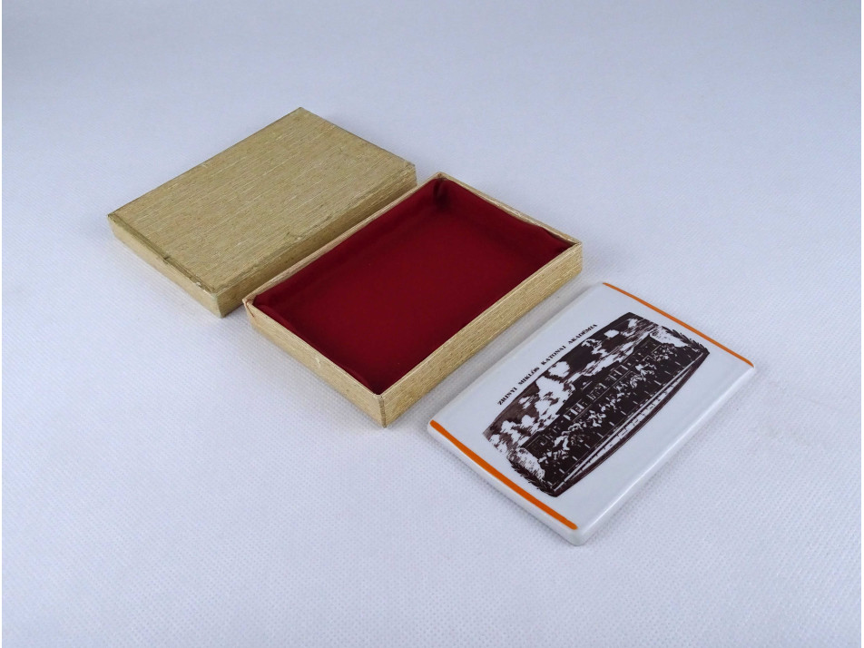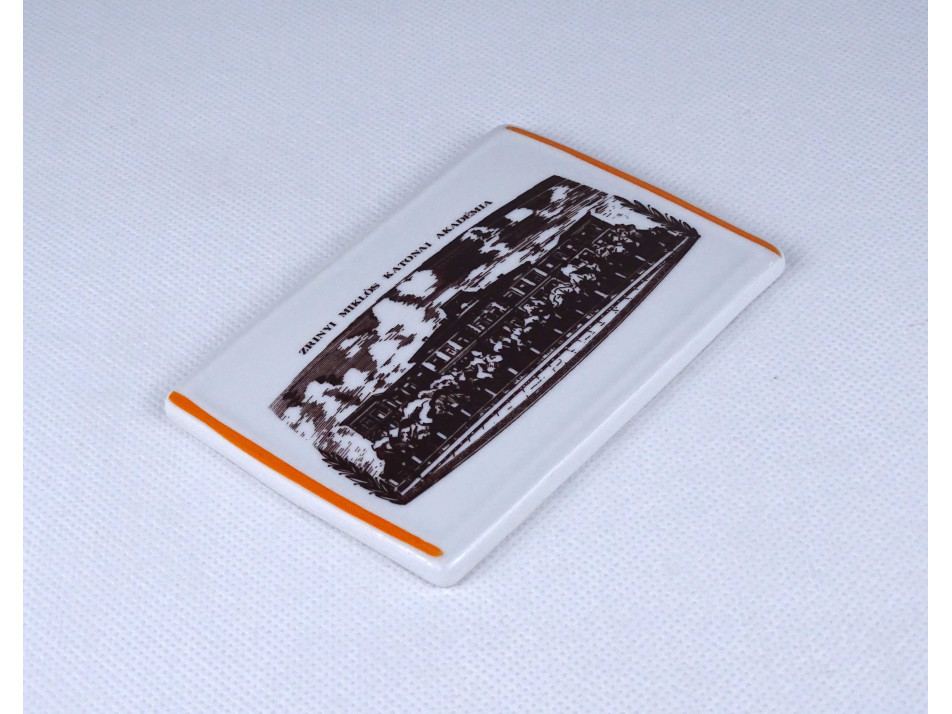 Régi, hibátlan állapotú, a Zrínyi Miklós Katonai Akadémia által megrendelt téglalap alakú Hollóházi porcelán emlékplakett eredeti papír dobozában. Rajta felirat és az akadémia épületének látképe látható.