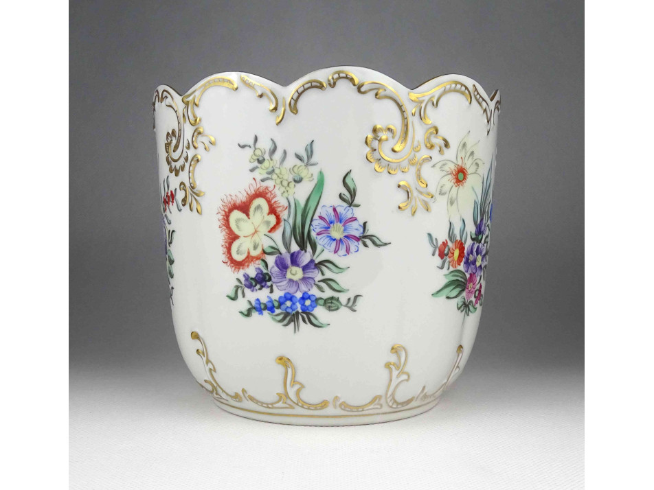 Hibátlan állapotú, nagy méretű gazdagon aranyozott, virágmintás jelzett Hollóházi porcelán kaspó.