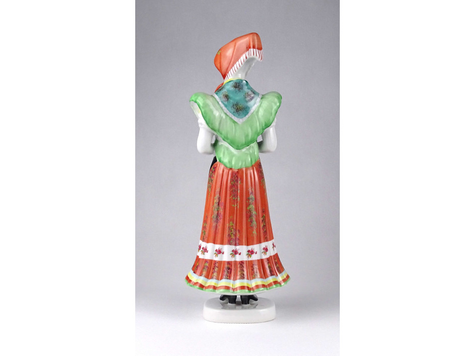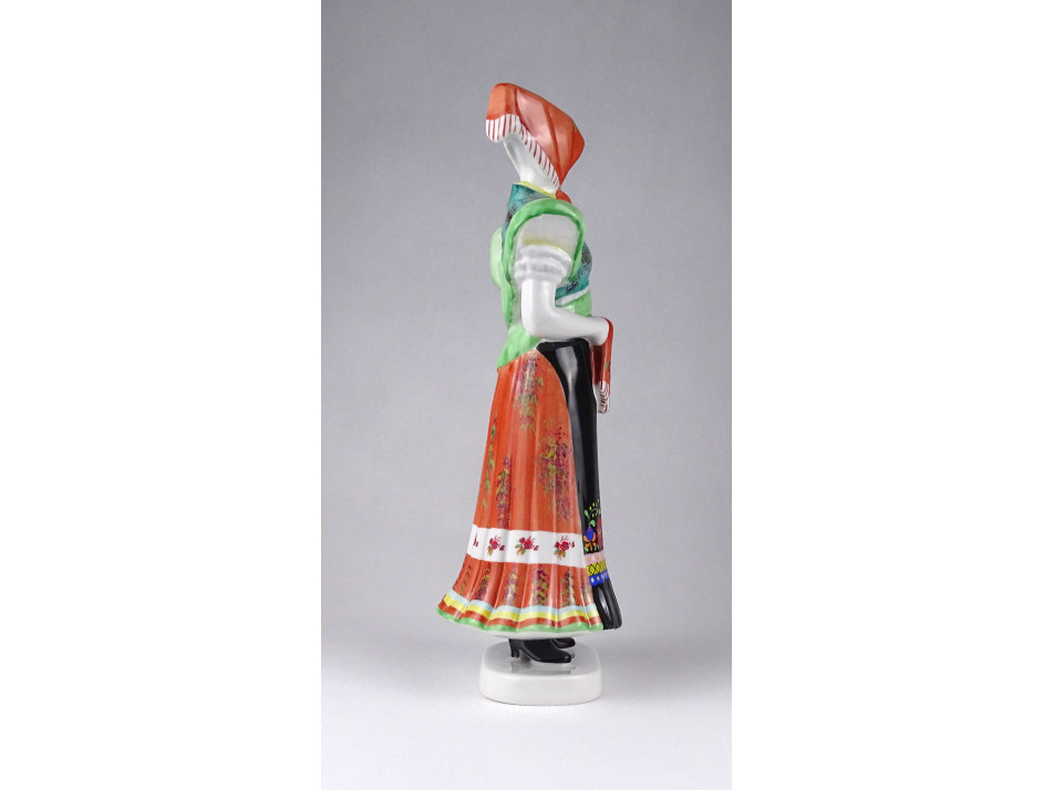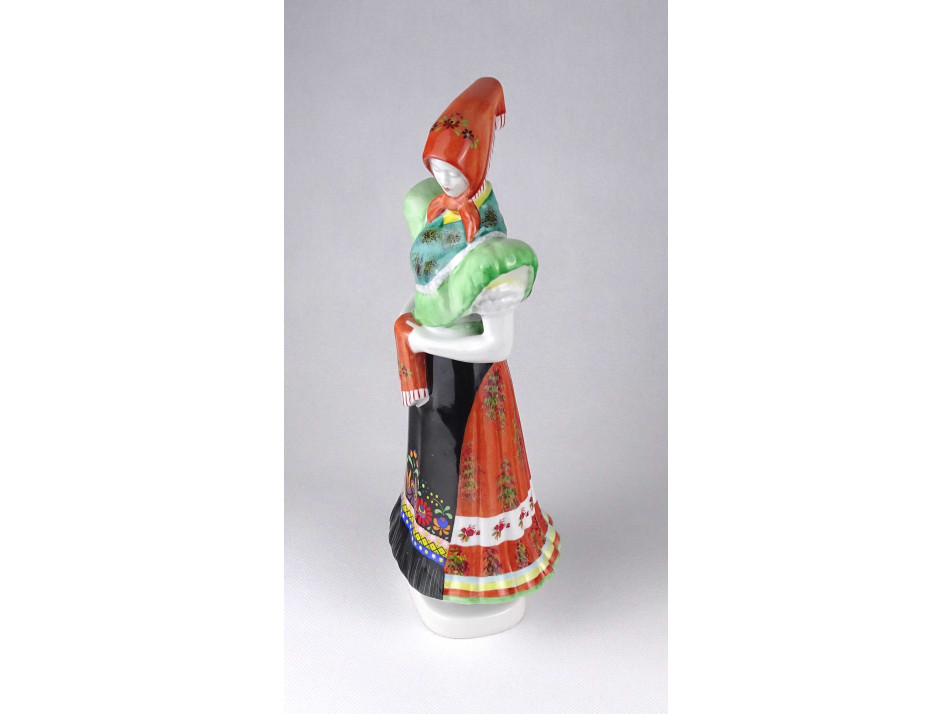 Régi, hibátlan állapotú, nagyméretű Hollóházi porcelán figura, fejkendős menyecske szobor matyó népviseletben. Kézi festéssel díszített.