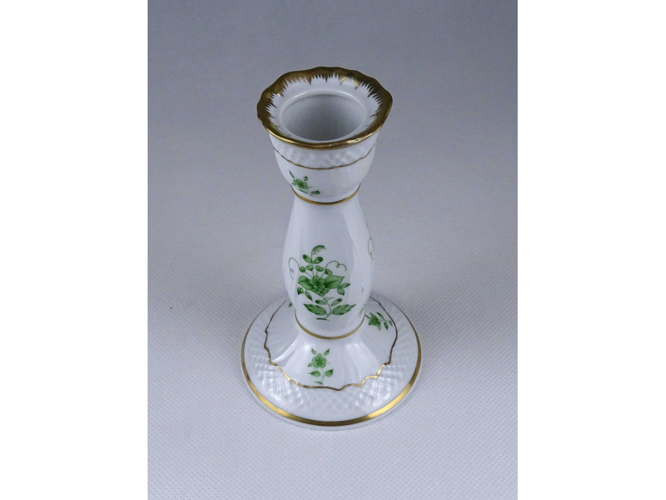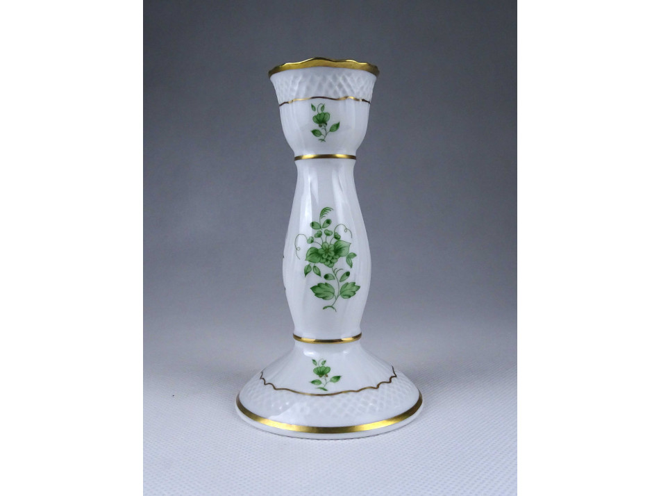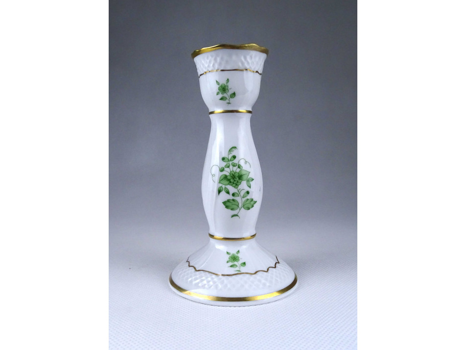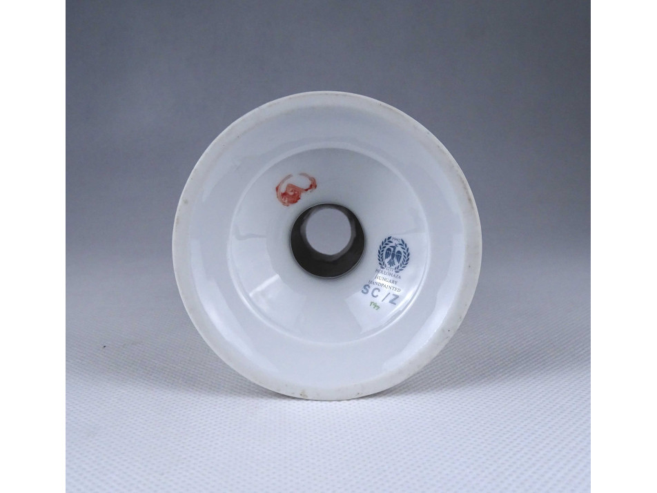Régi, Erika mintával díszített, aranyozott Hollóházi porcelán gyertyatartó. A gyertyatartó felső pereme restaurátor által szakszerűen javított.