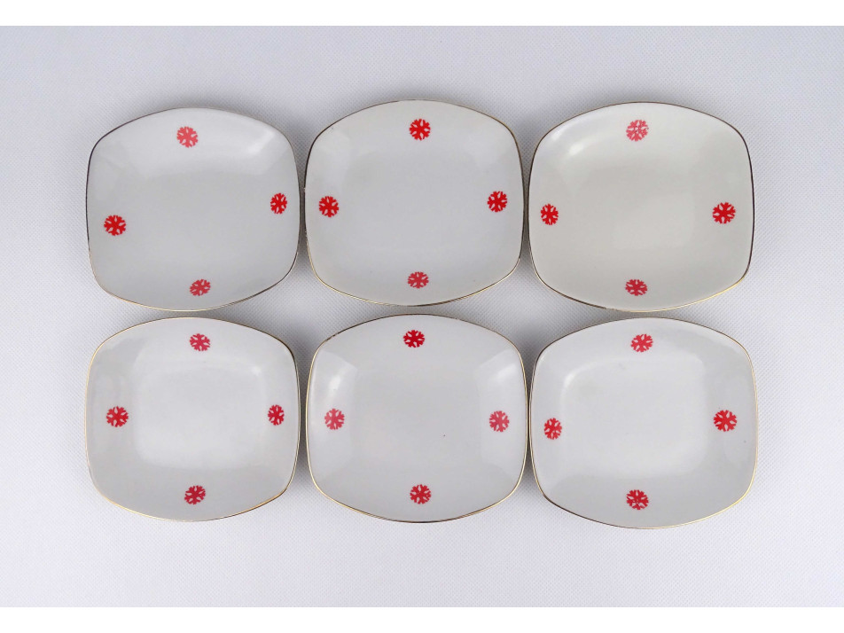 Retro, hibátlan állapotú, aranyozott szélű, piros hópehely mintával díszített modern, szögletes alakú süteményes porcelán tányér készlet. 6 darab.