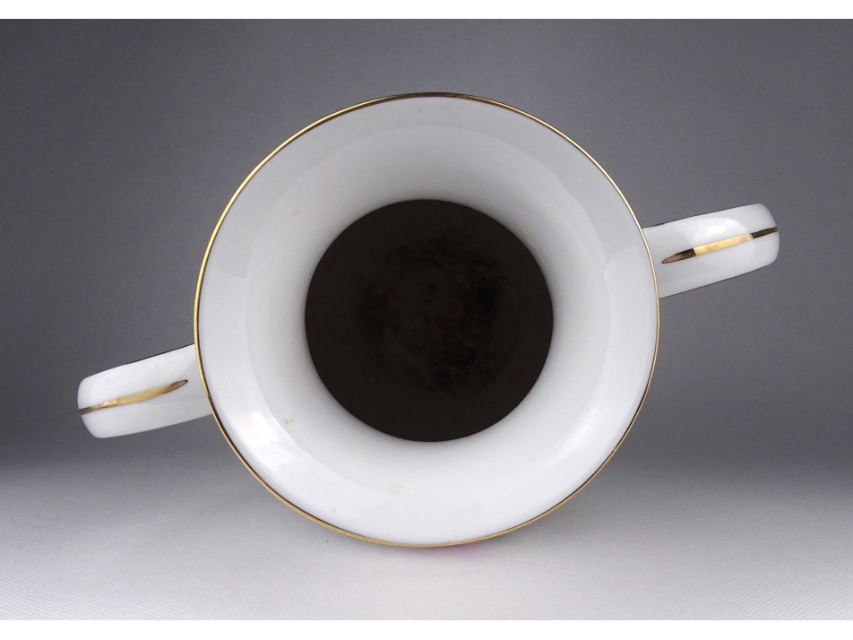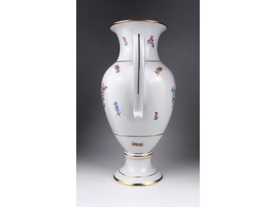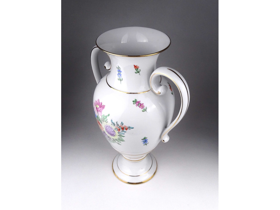 Nagyméretű, virágmintás, aranyozott Hollóházi porcelán díszváza, amfóra váza. Alsó peremén egy apró lepattanás látható.