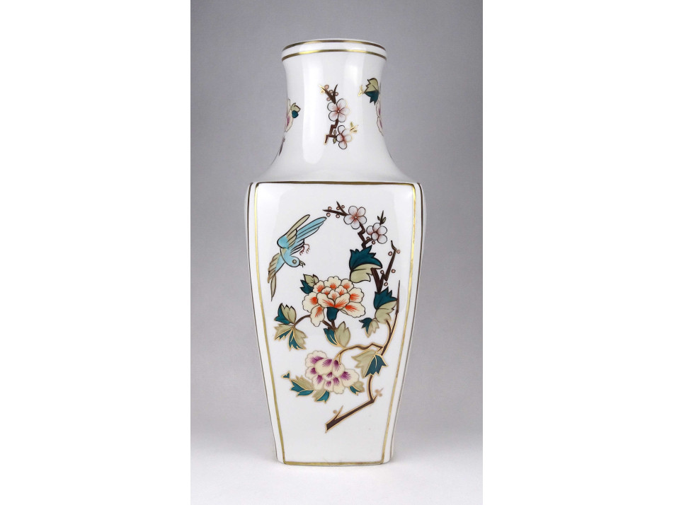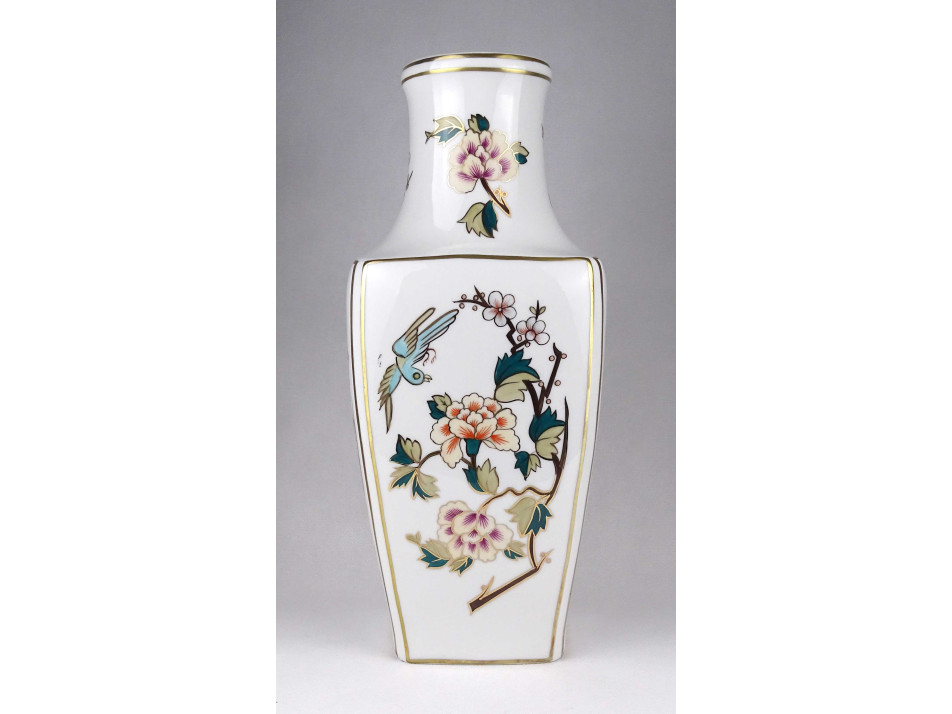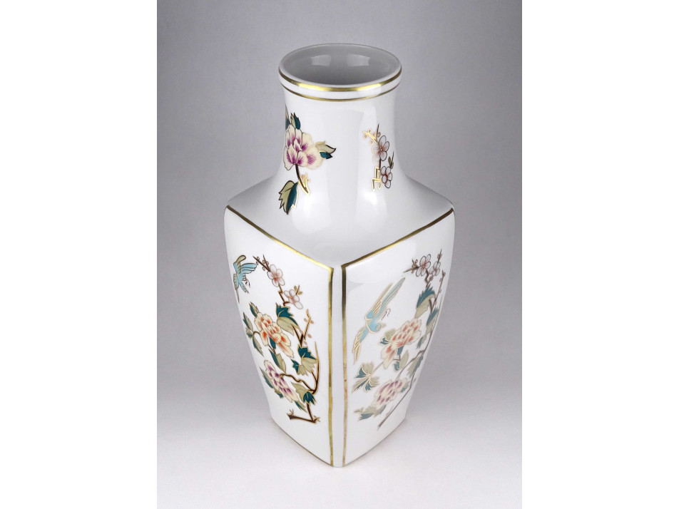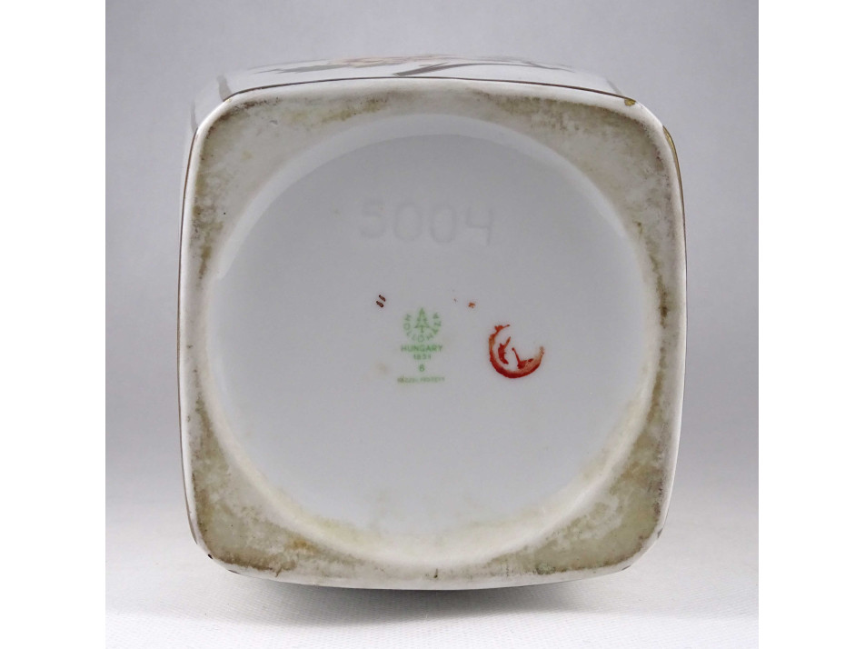 Hibátlan állapotú, virág és madár díszes, szögletes Hollóházi porcelán váza.
