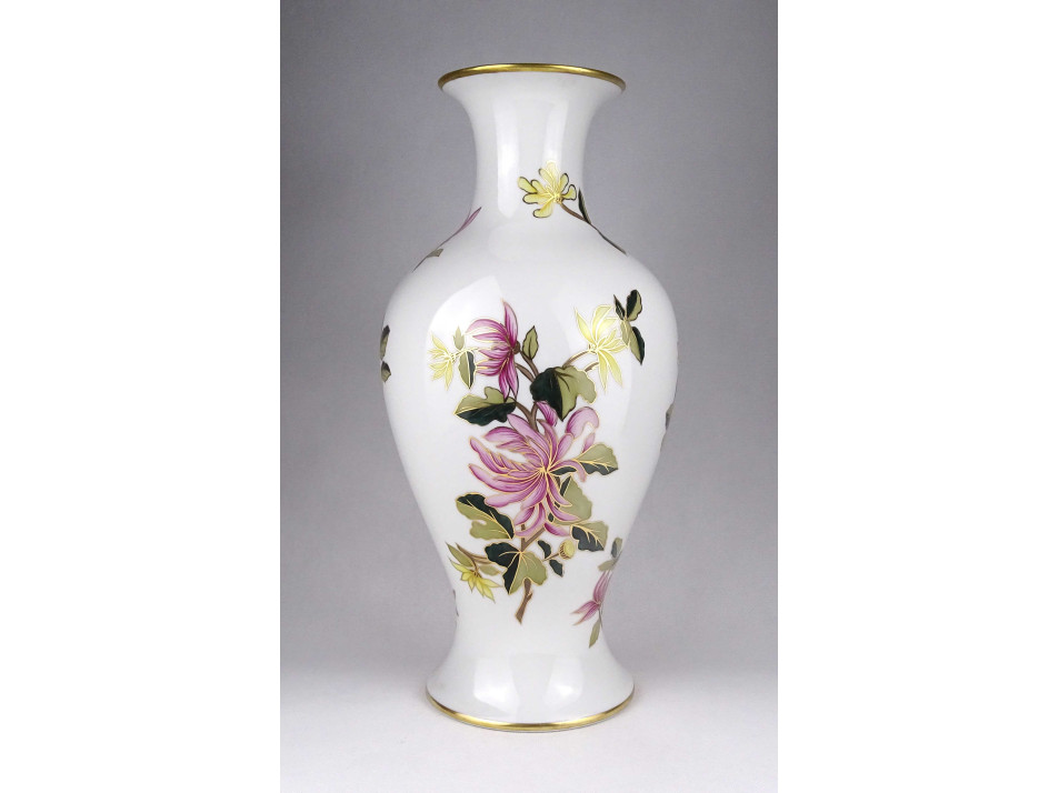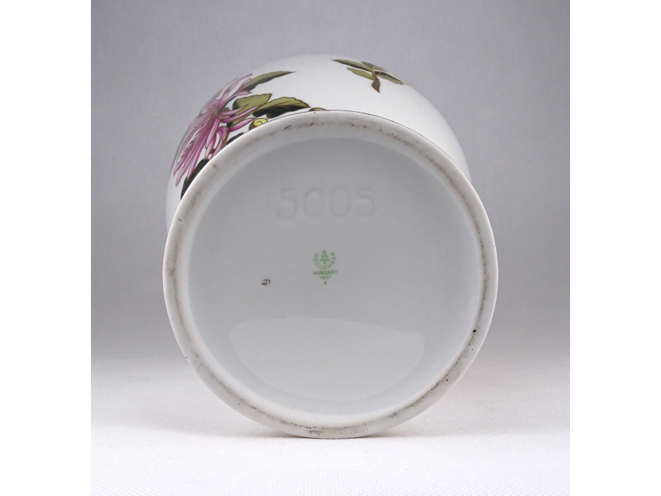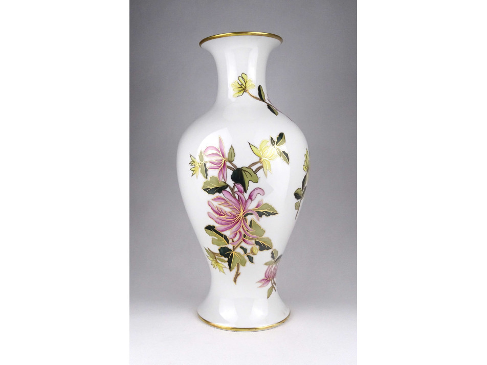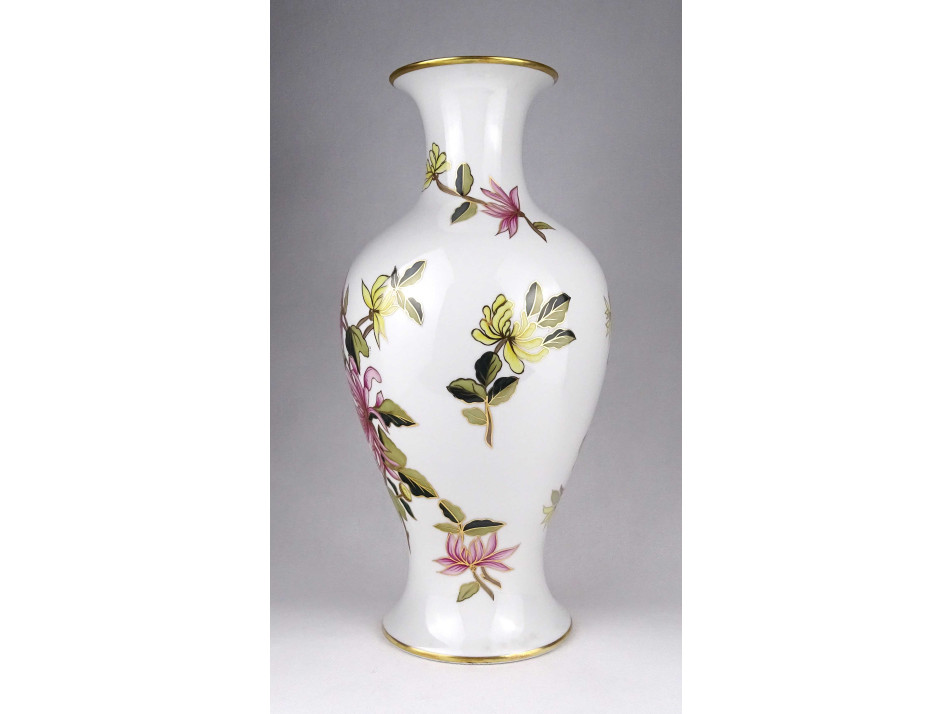 Hibátlan állapotú, gazdagon díszített, ritkán előforduló, nagyméretű, kézzel festett virágmintás, jelzett Hollóházi porcelán váza, virágváza.