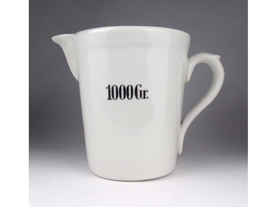 Hibátlan állapotú, belülről skálázott Zsolnay porcelán gyógyszertári mérőedény kancsó. Oldalán felirat: 1000 GR