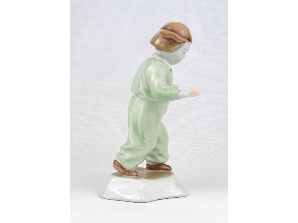 Régi, hibátlan állapotú, jelzetlen Zsolnay figurális porcelán szobor, járni tanuló sapkás kisfiú.