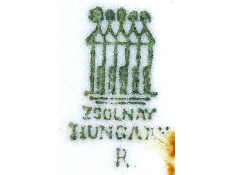 Alján zöld színű Zsolnay öttornyú márkajelzés