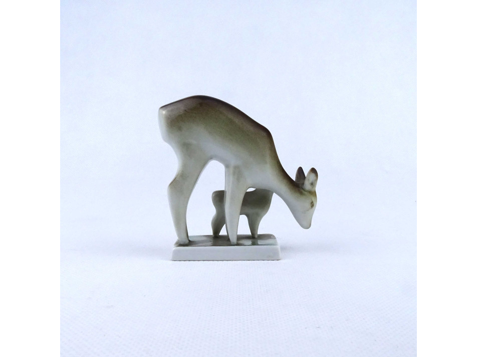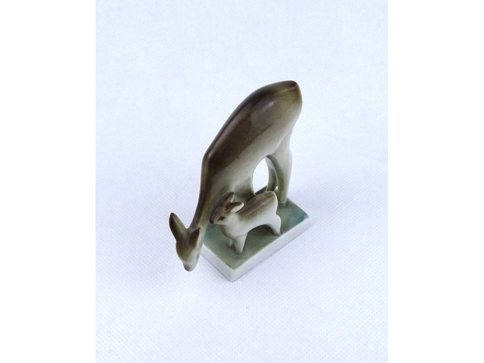 Régi, hibátlan állapotú Zsolnay porcelán őz figura, őzike páros, szobor talapzaton. Anya és gidája.