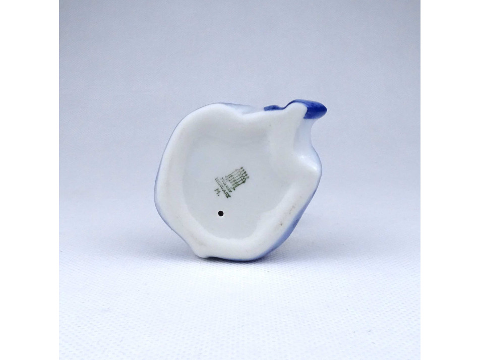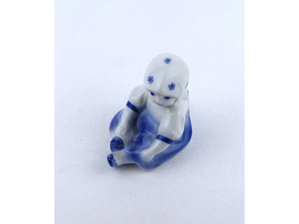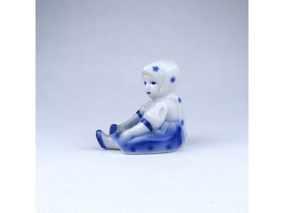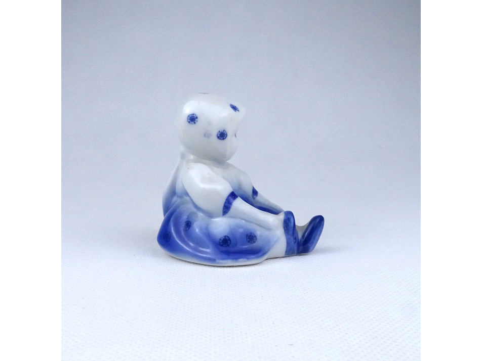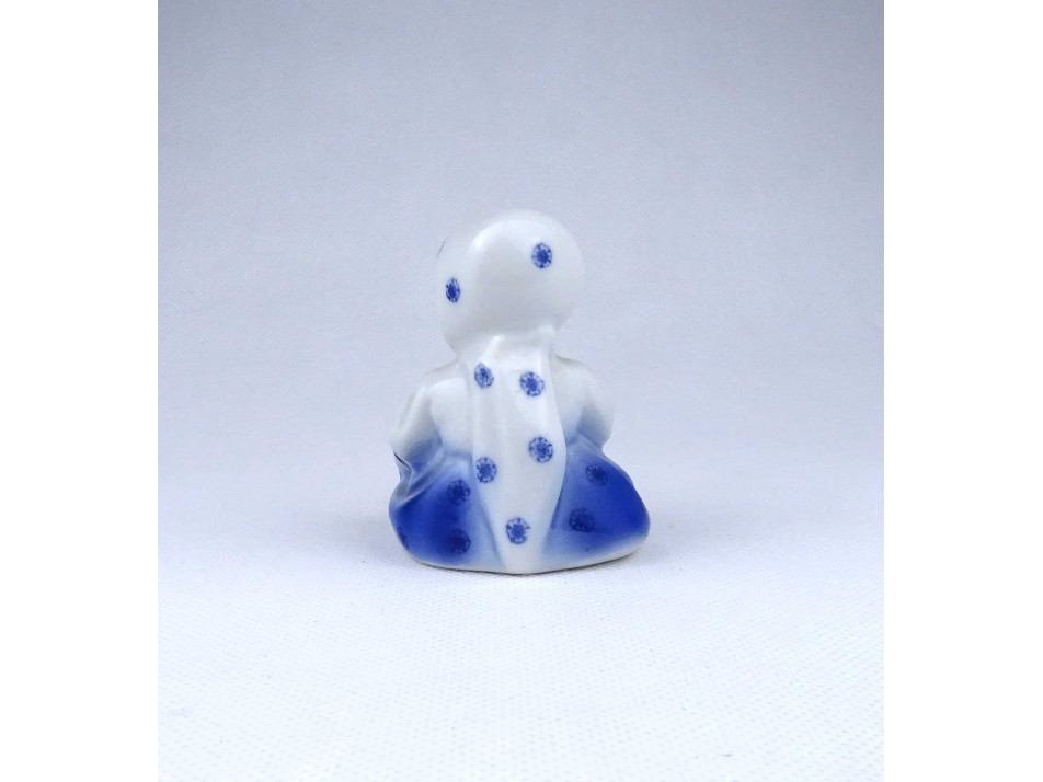 Régi, hibátlan állapotú, kék - fehér festésű Zsolnay porcelán figura, fejkendős ülő kislány.