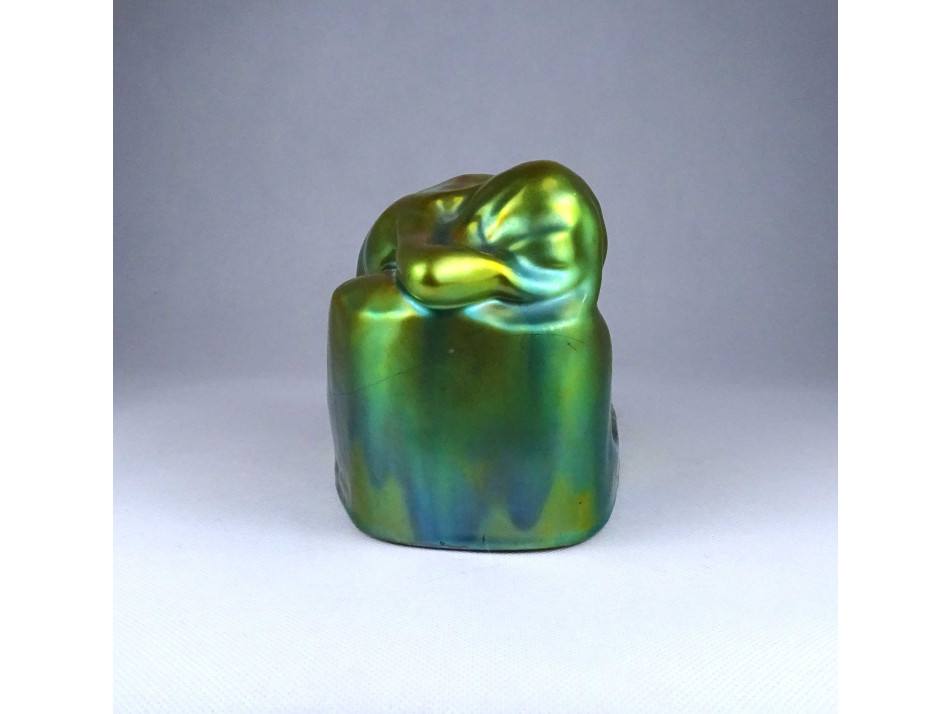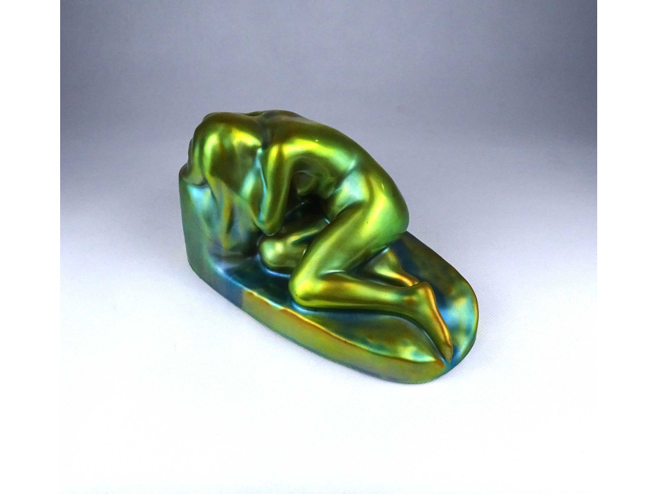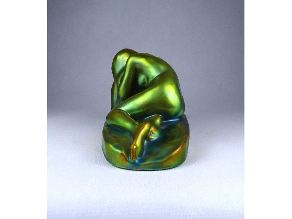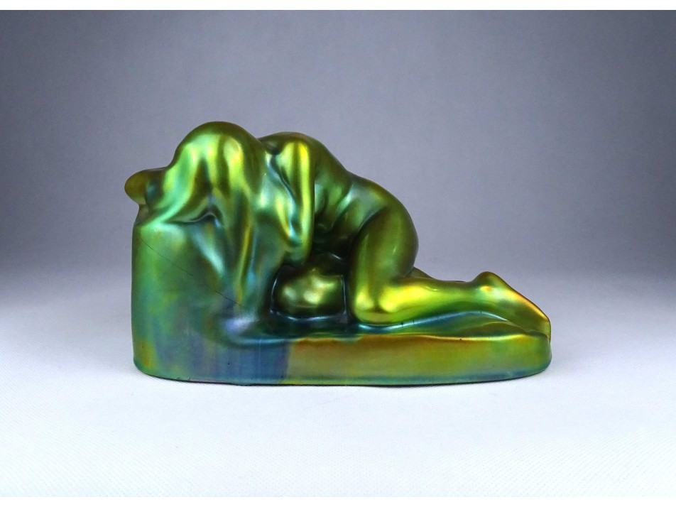 Régi, nagyméretű, szép állapotú, jelzett eozin mázas Zsolnay porcelán egész alakos női akt szobor talapzaton. Egy körbefutó repedés található rajta.