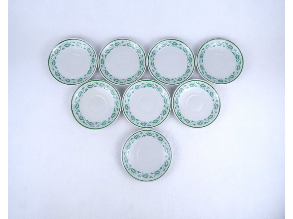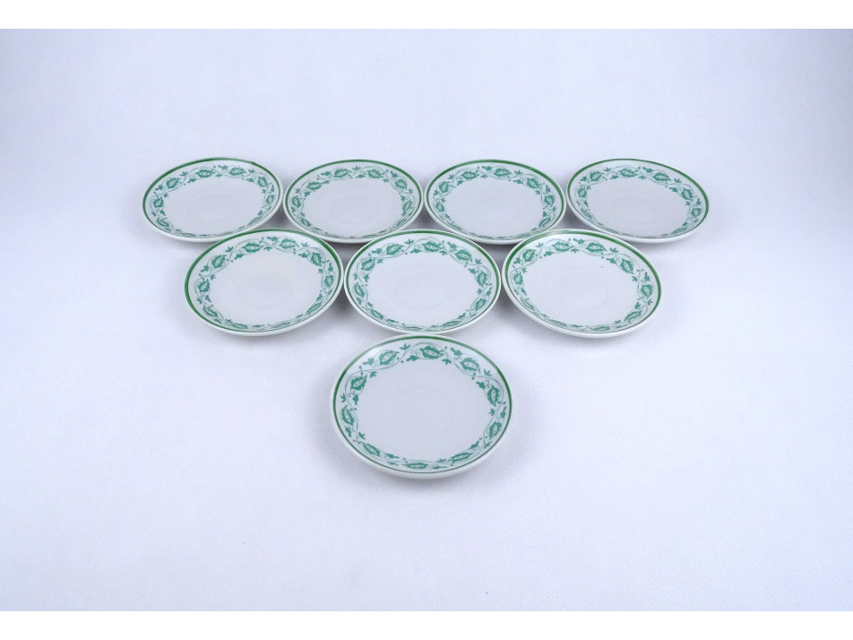 Régi zöld levélmintás Zsolnay porcelán kistányér kávés csészealj készlet 8 darab