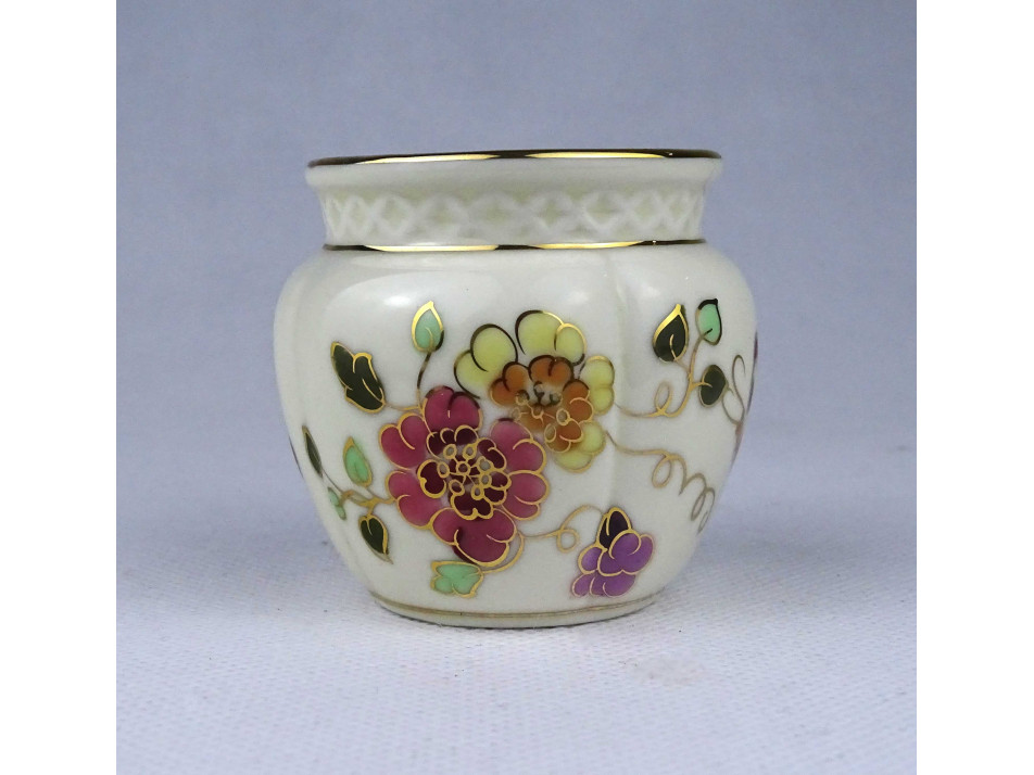 Régi szép állapotú, jelzett, vajszínű, aranyozással gazdagon díszített, pillangó mintás, gerezdes porcelán kisváza, kis kaspó. Oldalán egy helyen restaurátor által szakszerűen javított.