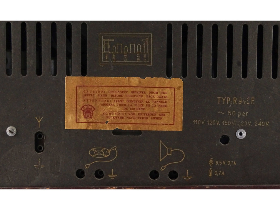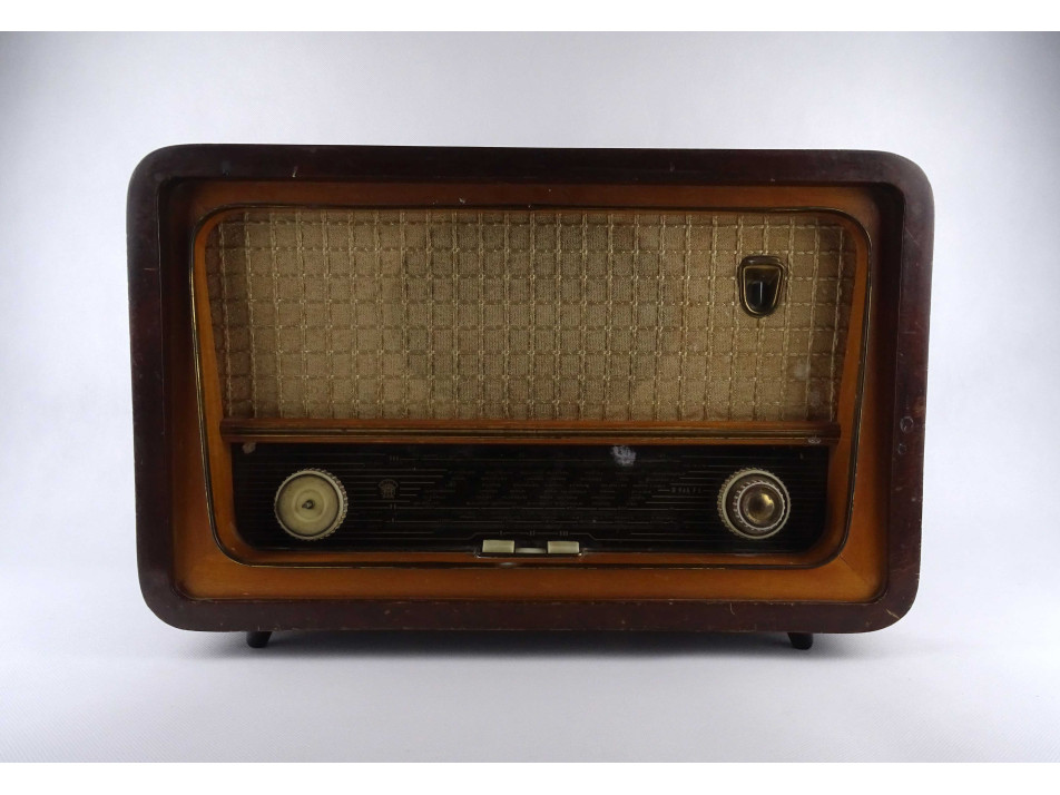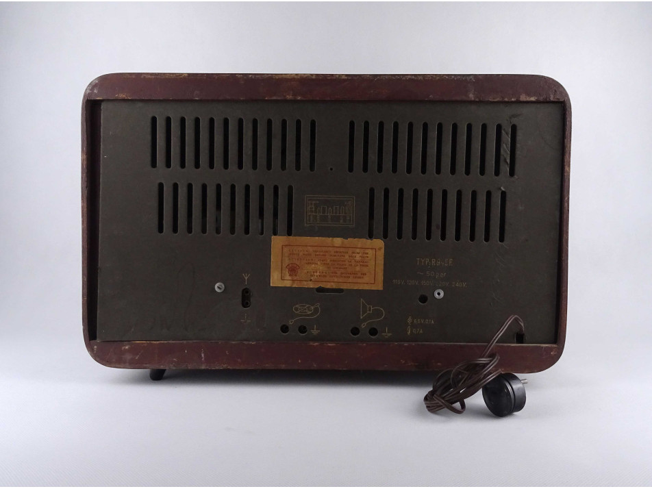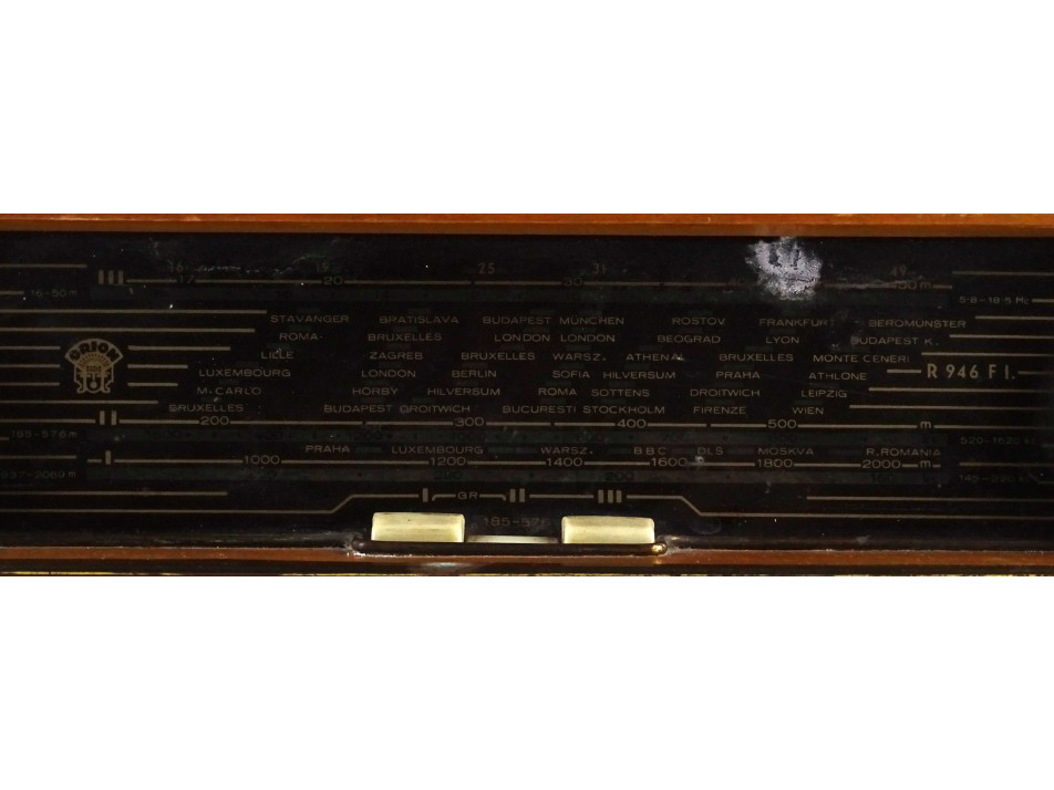 Régi furnérozott felületű fadobozos elektroncsöves antik rádió. Jelenleg nem működik, inkább alkatrésznek való. Felirat: ORION TYP R 946 F