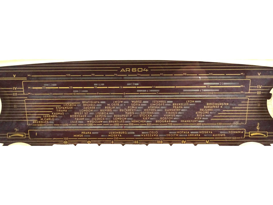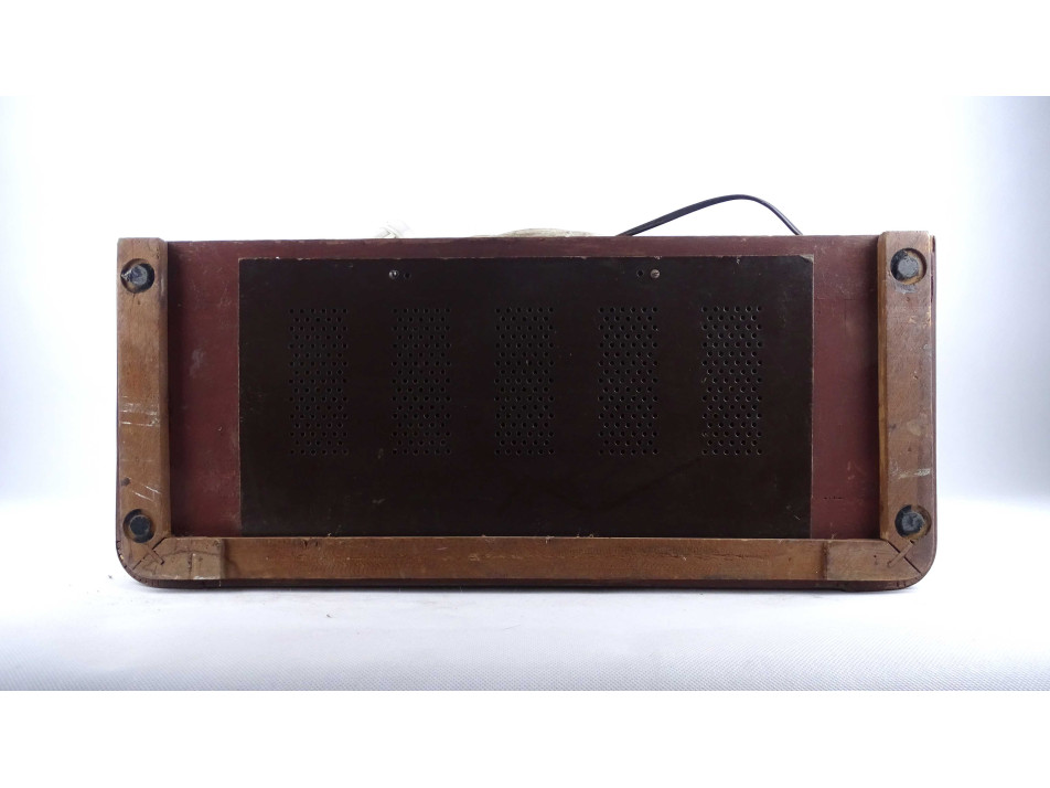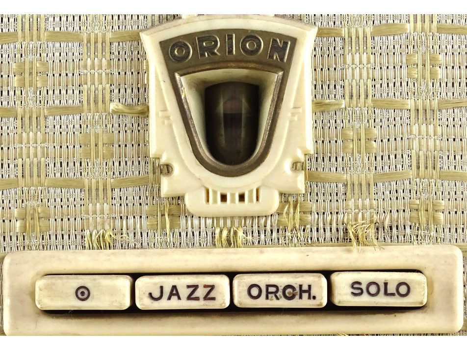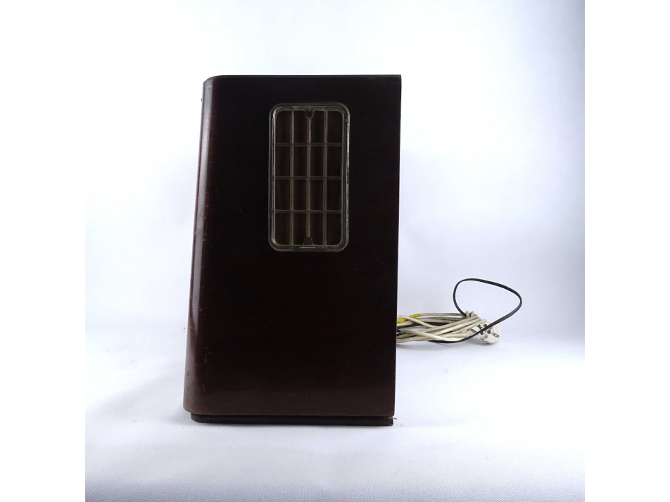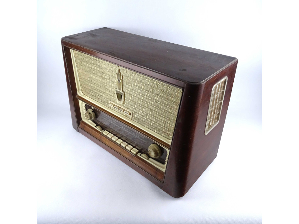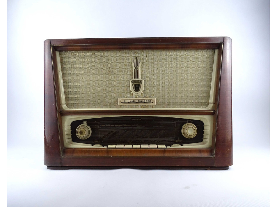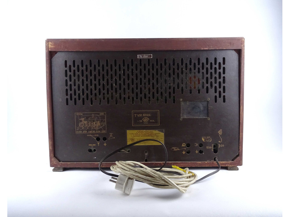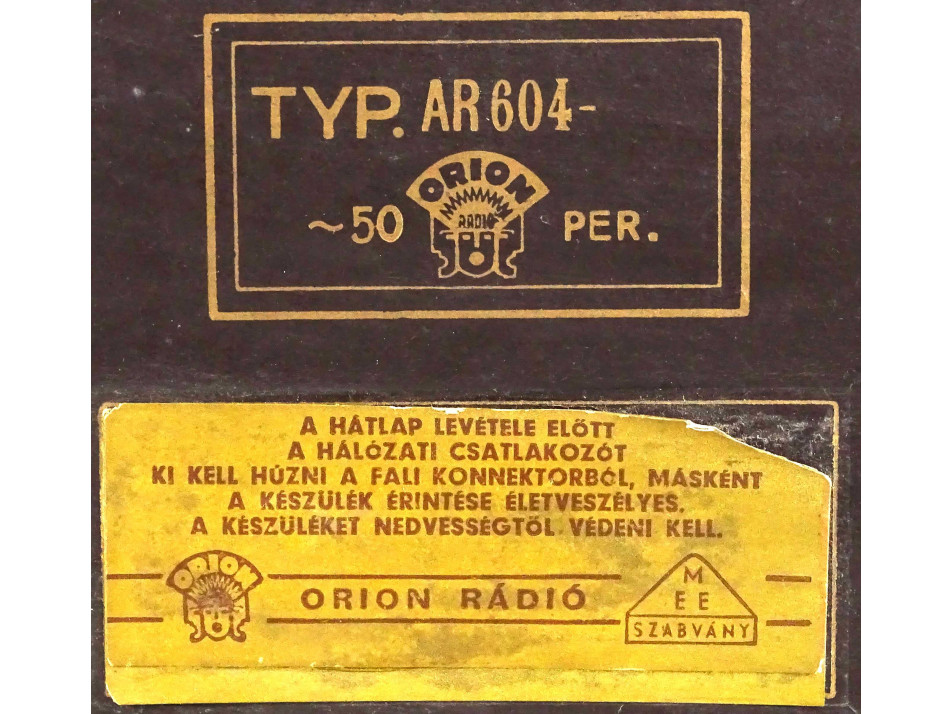 Régi, furnérozott felületű, fadobozos, elektroncsöves rádió. Bedugva világít, de nem működik. Felirat: ORION TYP AR 604