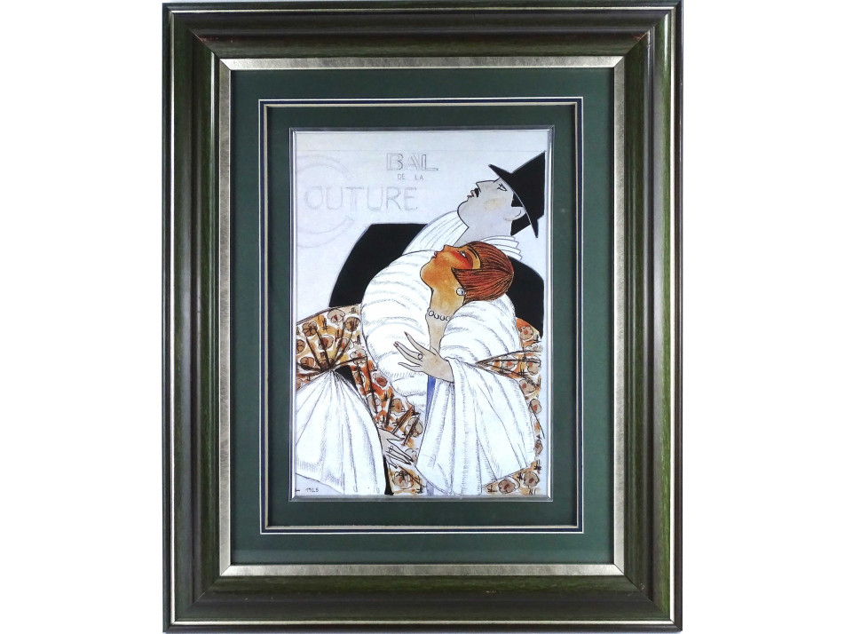 Georges Lepape: Bal de la Couture - nagyméretű színes art deco plakát reprodukció paszpartuzva, üveglap mögött, zöld színű modern keretben.