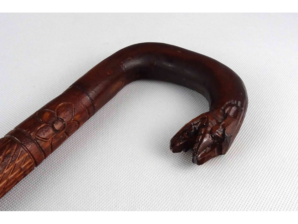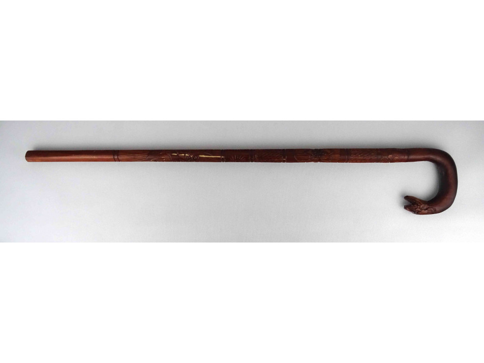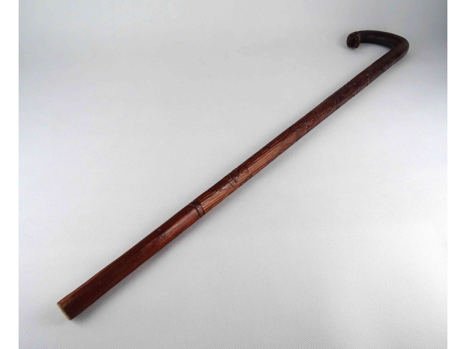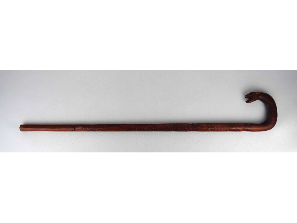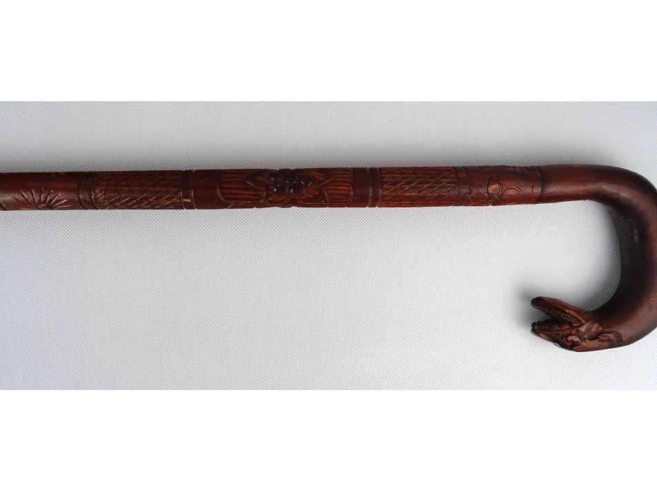 Régi, faragott kígyófejben végződő görbebot, sétabot, oldala faragott virágmintákkal díszített.