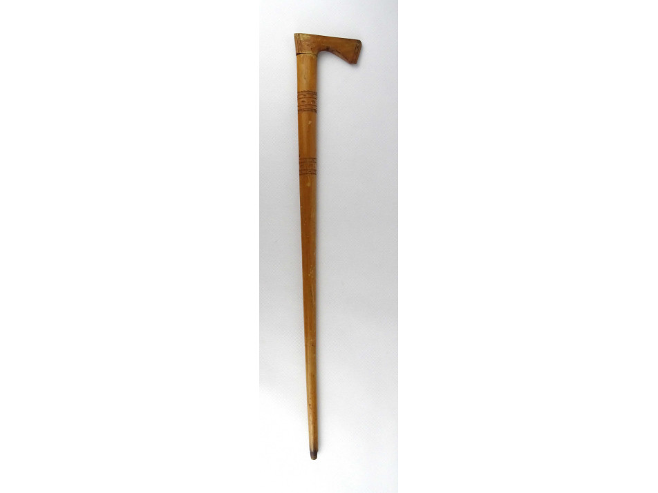 Régi, szép állapotú, faragott mintákkal díszített, fokosfejes sétabot, görbebot, túrabot. A bot végéről hiányzik a fém koptató.