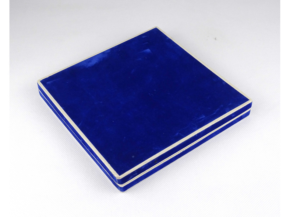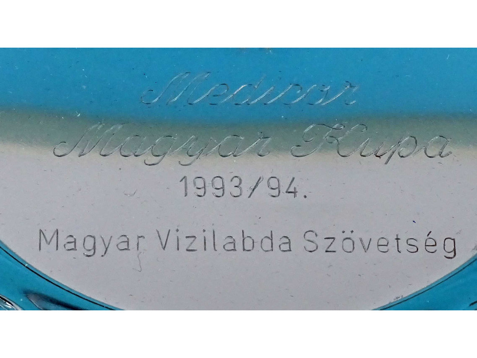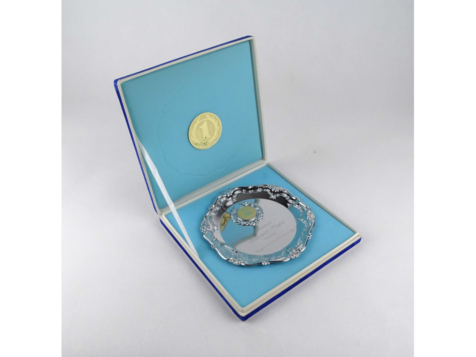 Hibátlan állapotú fém dísztál, vizilabda kupa, sport díj, kék bársony díszdobozban.
