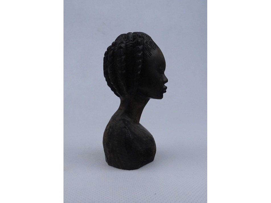 Hibátlan állapotú, kisméretű, afrikai törzsi művészeti dísztárgy, faszobor. Érdekes frizurájú fiatal nőt ábrázoló mellszobor, fafaragvány, nagyon nehéz sűrű, egzotikus kemény fából.