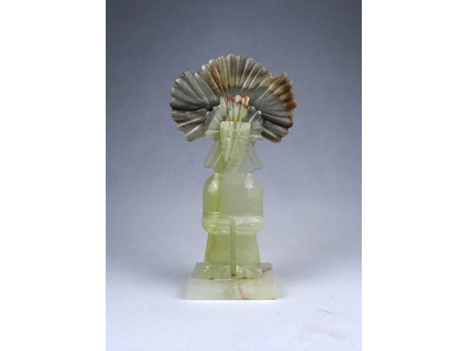 Hibátlan állapotú, világos színű onixból faragott mexikói istenség szobor, látványos fejdísszel rendelkező ülő emberalak.