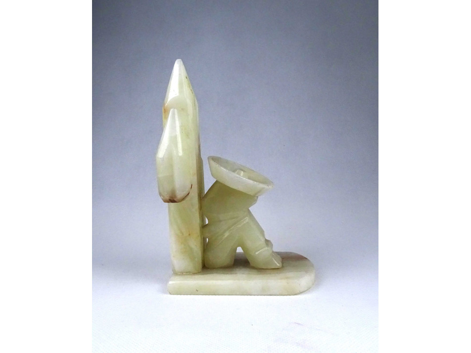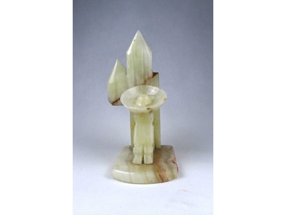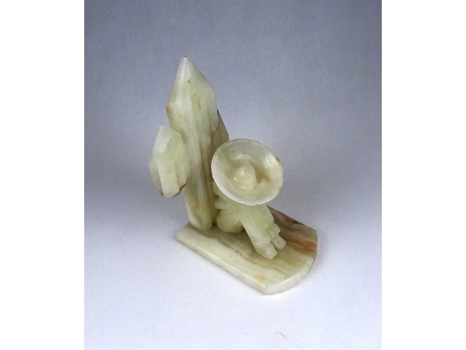 Hibátlan állapotú, világos színű onixból faragott mexikói szobor, kaktusznak támaszkodva ülő sombreros emberalak, könyvtámasz.