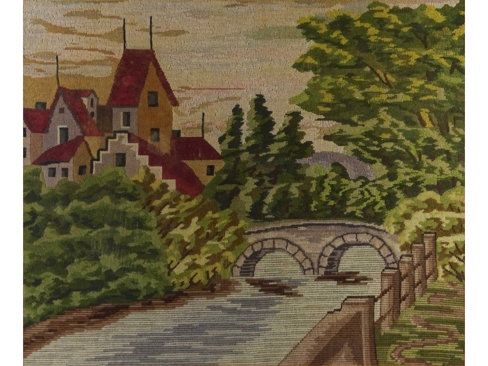 Régi, hibátlan állapotú vastag arany színű keretben, üveglap mögött, arany színű paszpartuban található finom, részletgazdag színes tűgobelin kézimunka, tájkép. Falra akasztási lehetőséggel rendelkezik.