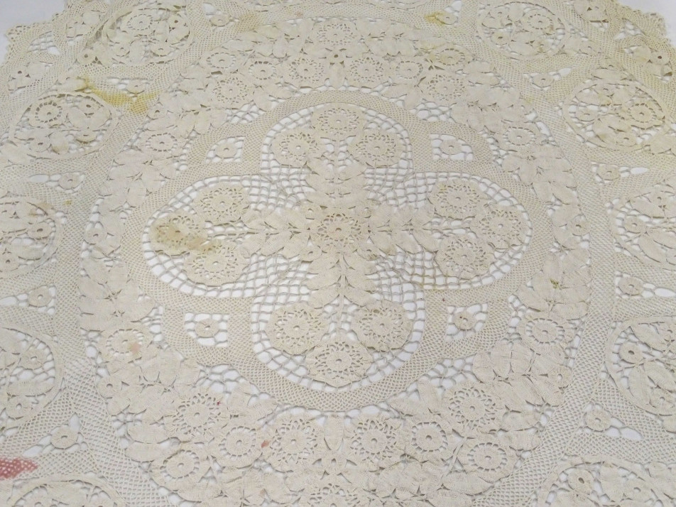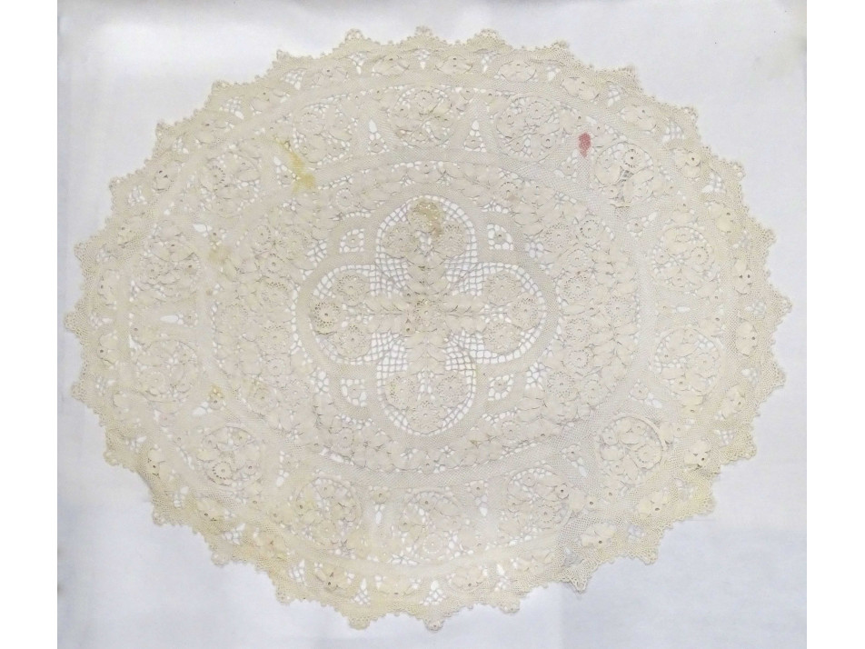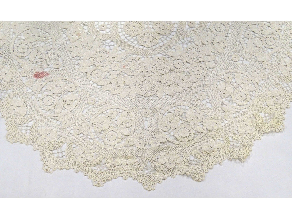 Régi, szép állapotú, nagyméretű, kör alakú, gazdagon hímzett, fehér csipketerítő, aprólékos kézimunka. A terítőn több folt, elszíneződés látható.