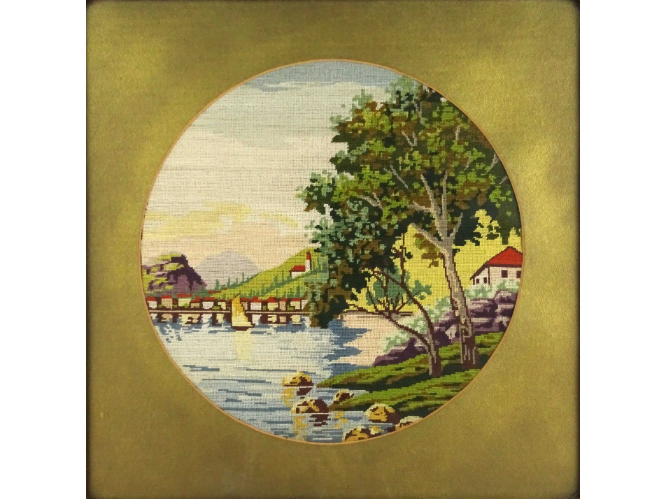 Szép állapotú, régi arany színű blondel keretben üveglap mögött, arany színű, kör alakú paszpartuban lévő finom tűgobelin, kézimunka. Akasztási lehetőséggel rendelkezik.