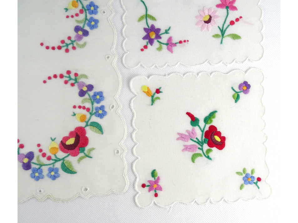 Régi, hímzett, kalocsai virágmintás terítő, kézimunka, 5 darab egy csomagban.