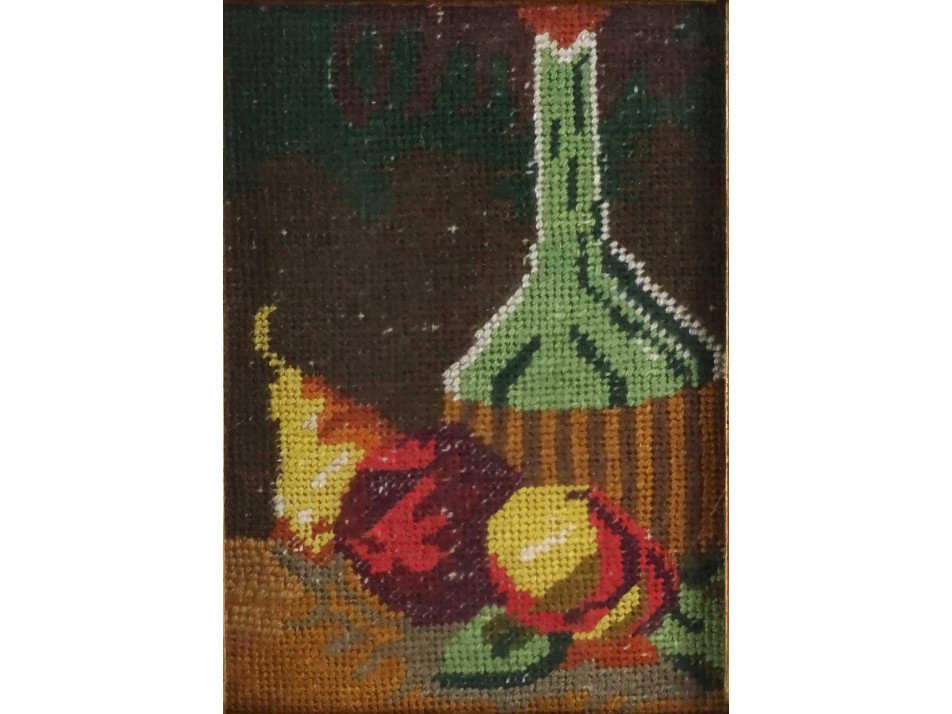 Régi csendéletet ábrázoló tűgobelin pár, szép állapotú, széles, aranyozott díszes keretben, üveglap mögött. Akasztási lehetőséggel rendelkeznek.