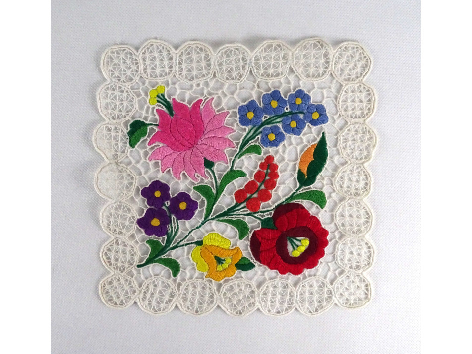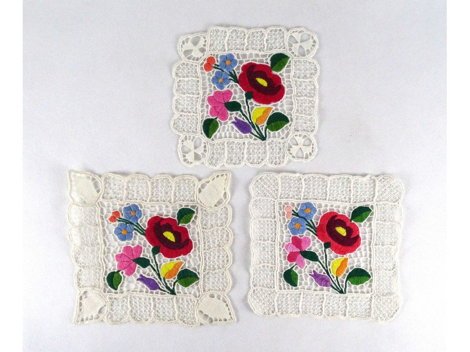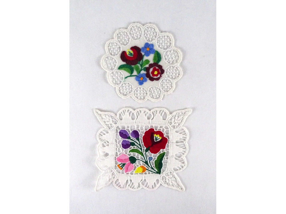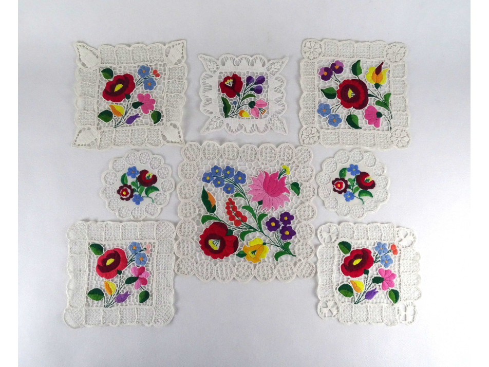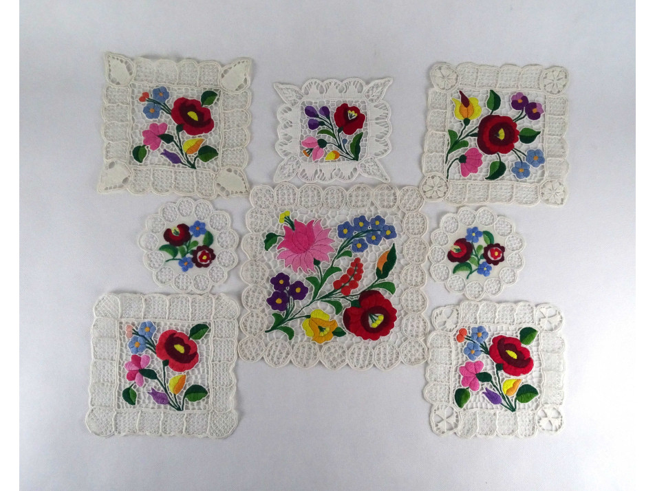 Nyolc darab, aprólékosan hímzett kalocsai motívumos csipke terítő, kézimunka egy csomagban.