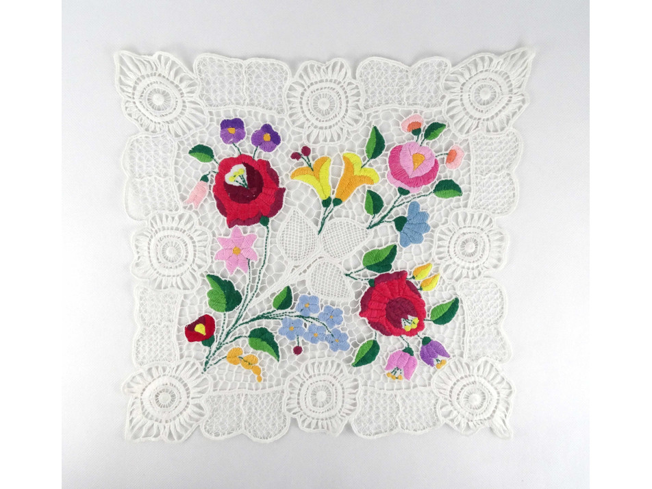 Régi gazdagon hímzett kalocsai mintás csipke terítő 35 x 35 cm