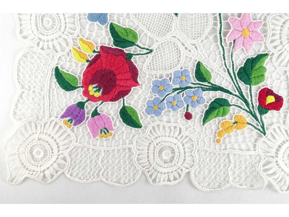 Régi, négyzet alakú, gazdagon és aprólékosan hímzett, kalocsai motívumos csipke terítő, kézimunka díszterítő.
