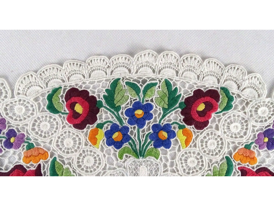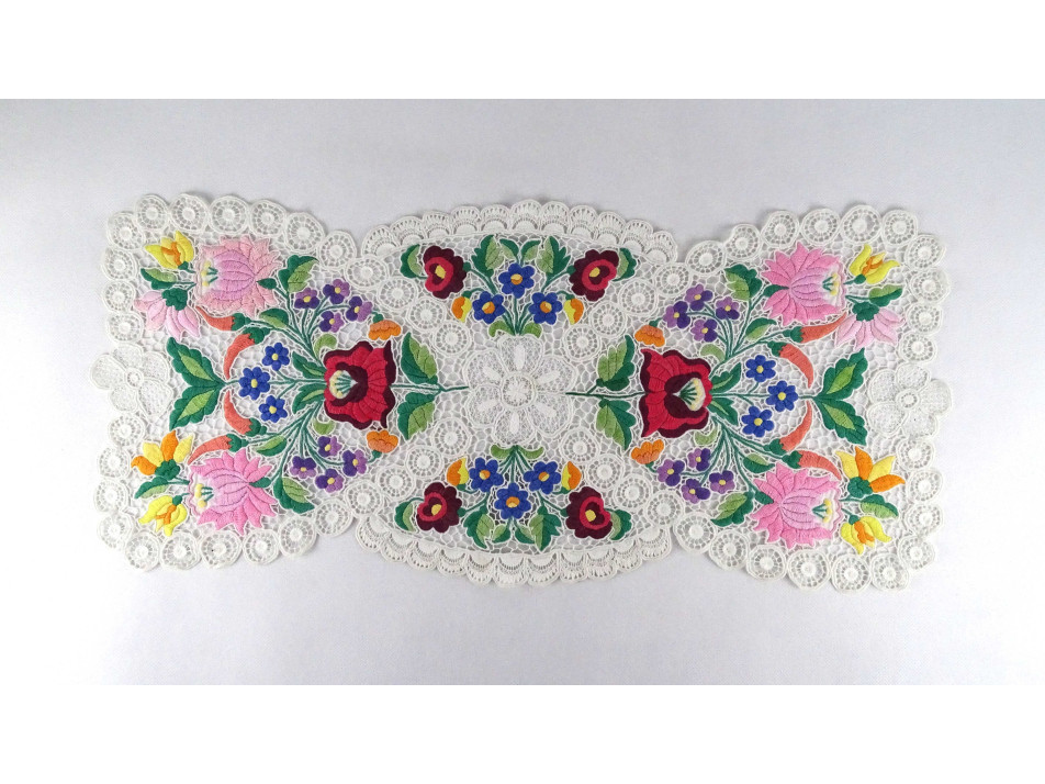 Régi gazdagon hímzett kalocsai mintás csipke terítő 62 x 28 cm