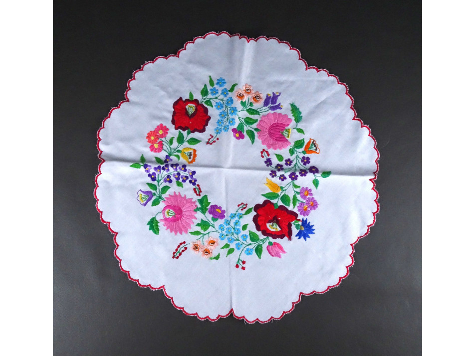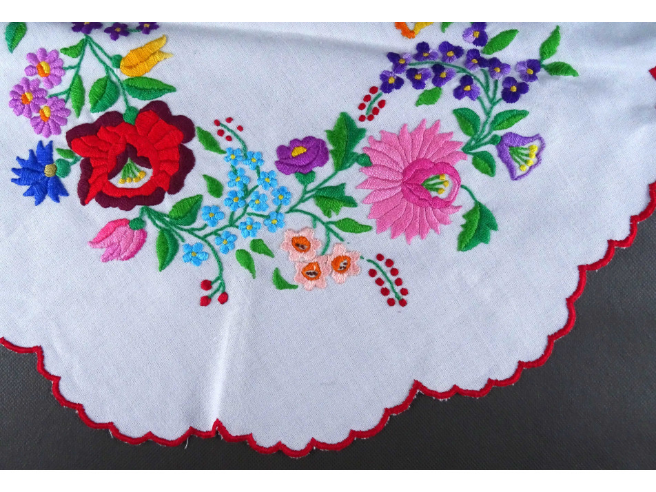Régi, hibátlan állapotú, kör alakú, aprólékosan hímzett kalocsai mintás vászon terítő.