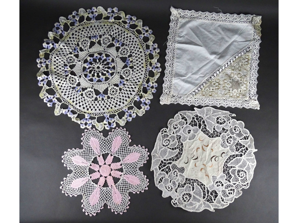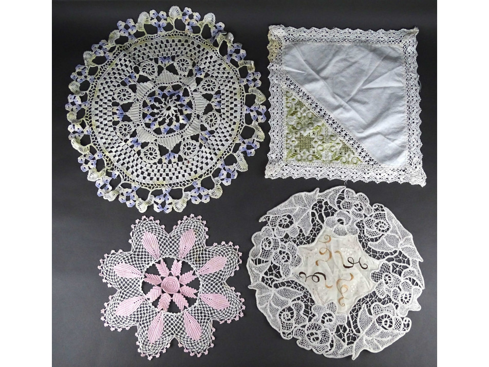 Régi, szép állapotú, közepes méretű, különleges, horgolt hímzett csipketerítő csomag, 4 darab egyben.