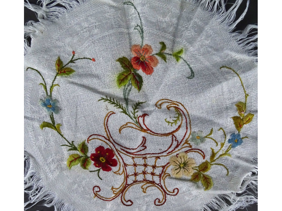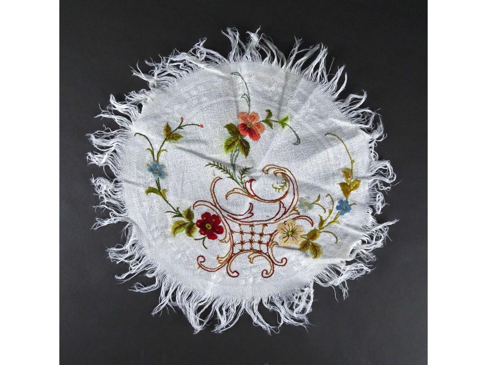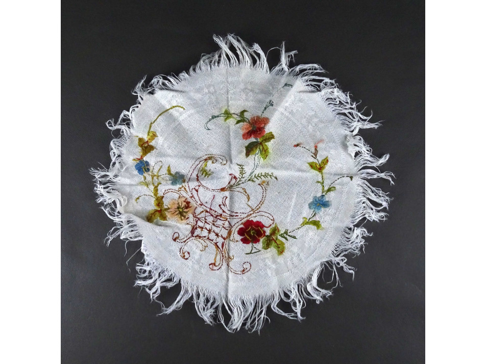 Régi, hibátlan állapotú, kerek virágos mintákkal díszített, hímzett kézimunka, vászon asztali terítő.