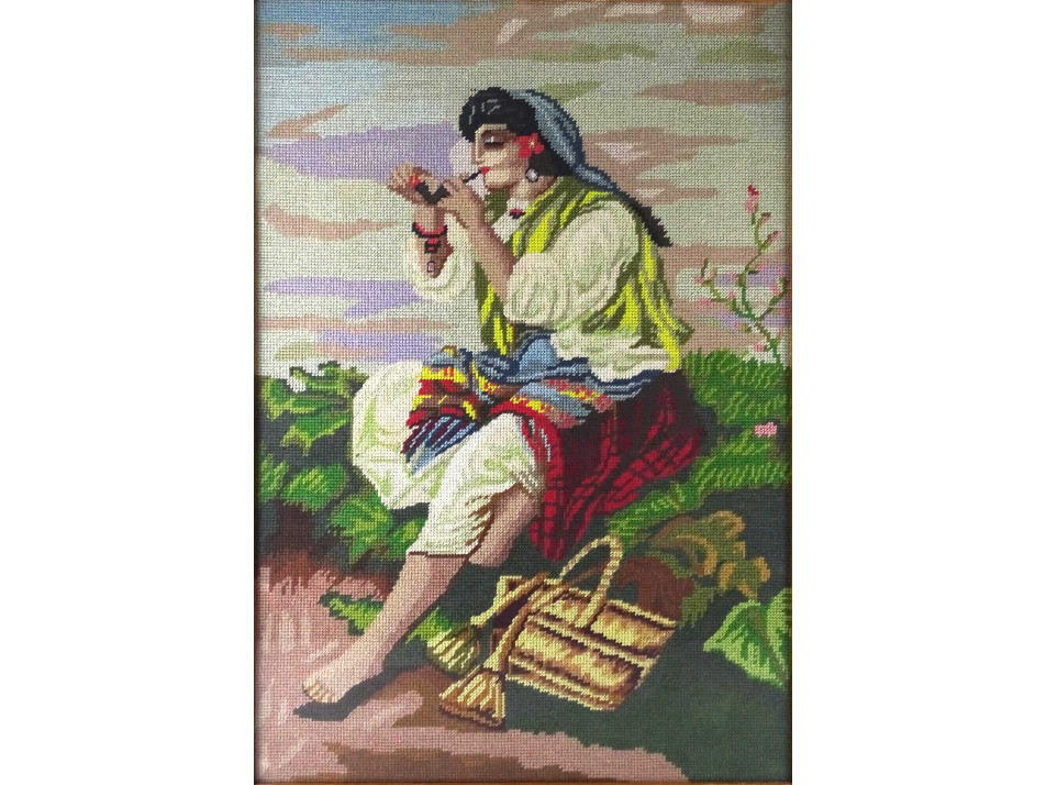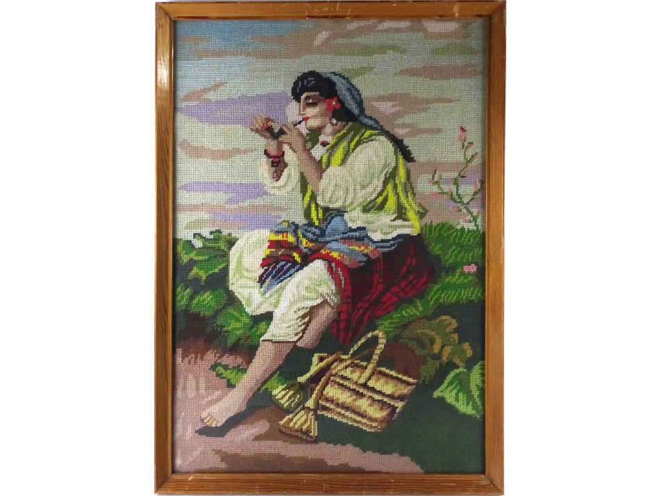 Id. Vastagh György után : Pipára gyújtó cigánylány - régi nagyméretű gobelin 66 x 46 cm