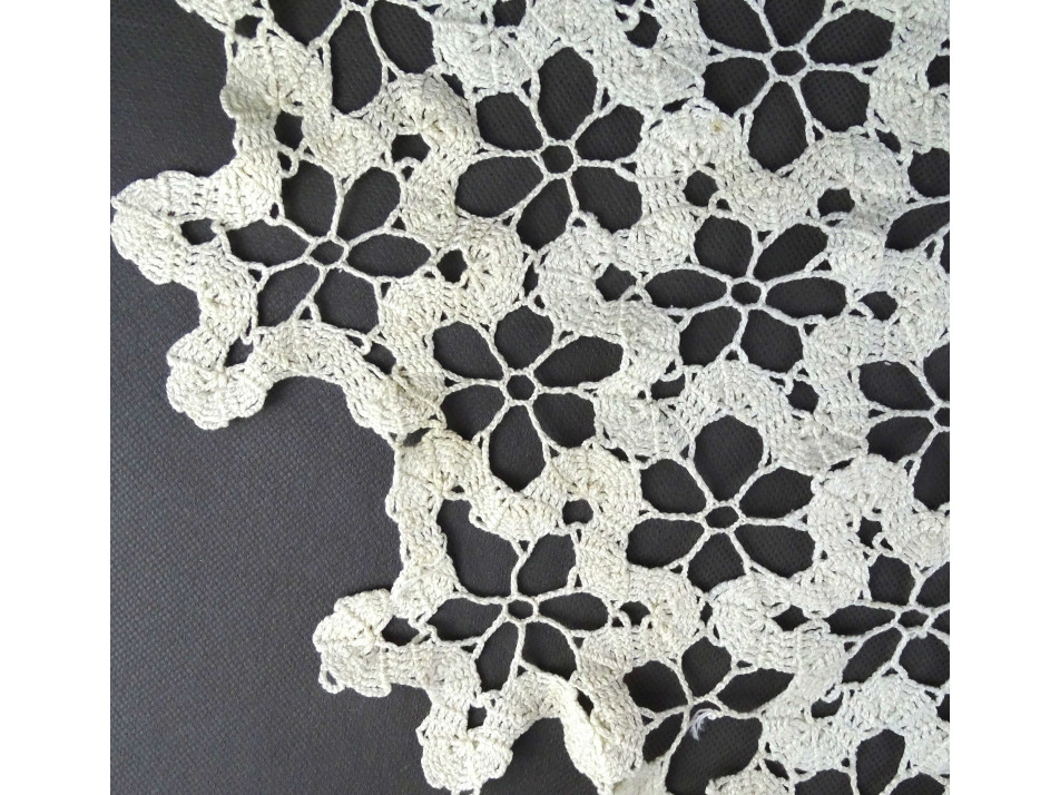 Régi, hibátlan állapotú, nagyméretű, hatszög alakú, virágmintás fehér csipketerítő.